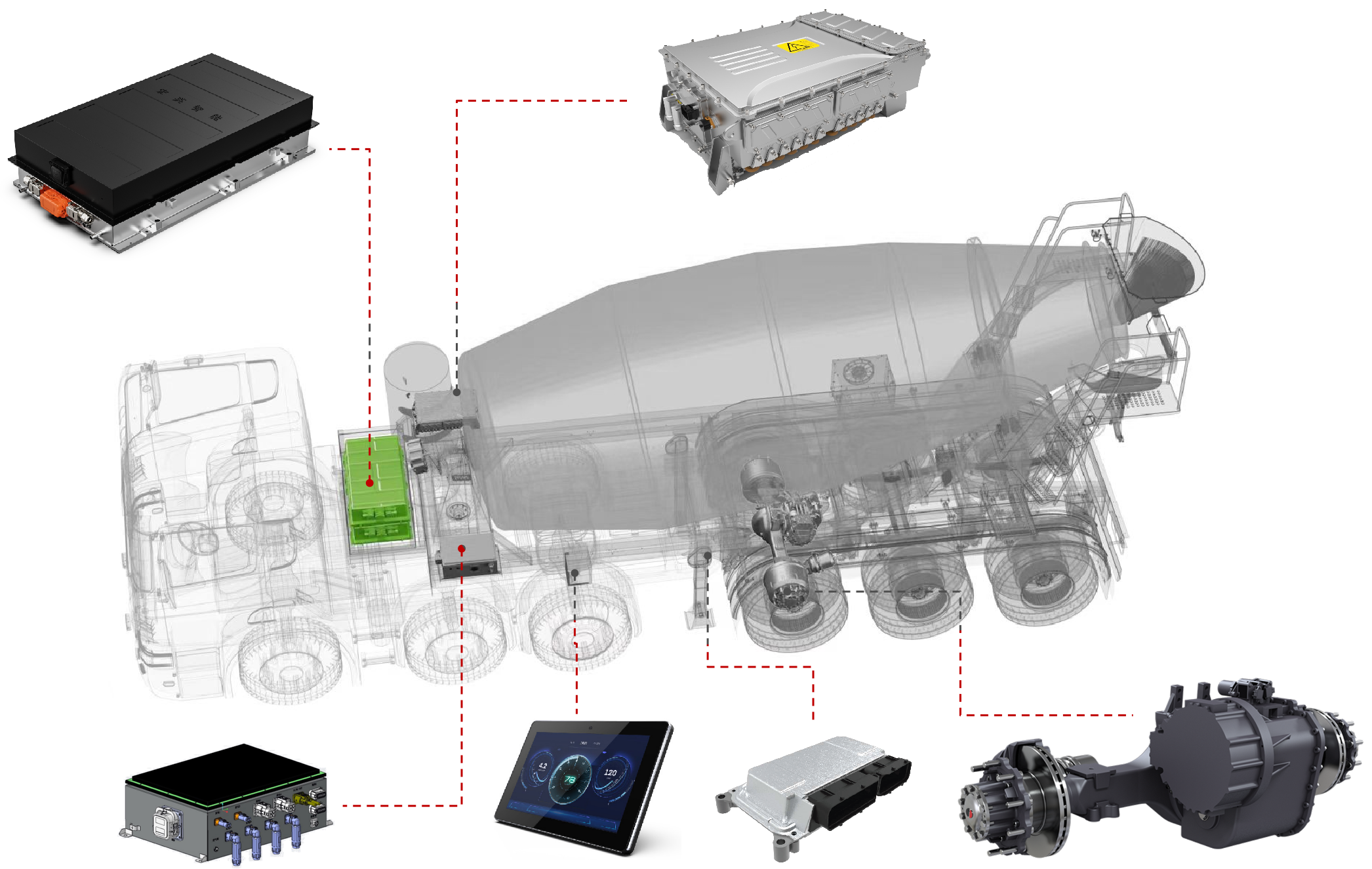展会上,6686官方登录入口网页版的智电一体化解决方案引起了广泛关注。工程师团队在现场为参展观众详细介绍了混合动力牵引搅拌半挂车的系统方案。该方案基于6686官方登录入口网页版历经多年开发的eMagi智电平台,针对牵引搅拌半挂车进行了定向开发,涵盖以下几个方面: