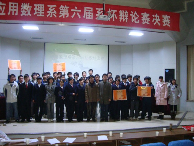 2009年12月6日,应用数理系第六届“系杯”辩论赛决赛在学术报告厅隆重举行。各兄弟系辩论赛最佳辩手应邀担任本次比赛的评委,应用数理系党总支副书记水心宝,团总支副书记梁雪松和各系学生会主席观看了比赛。