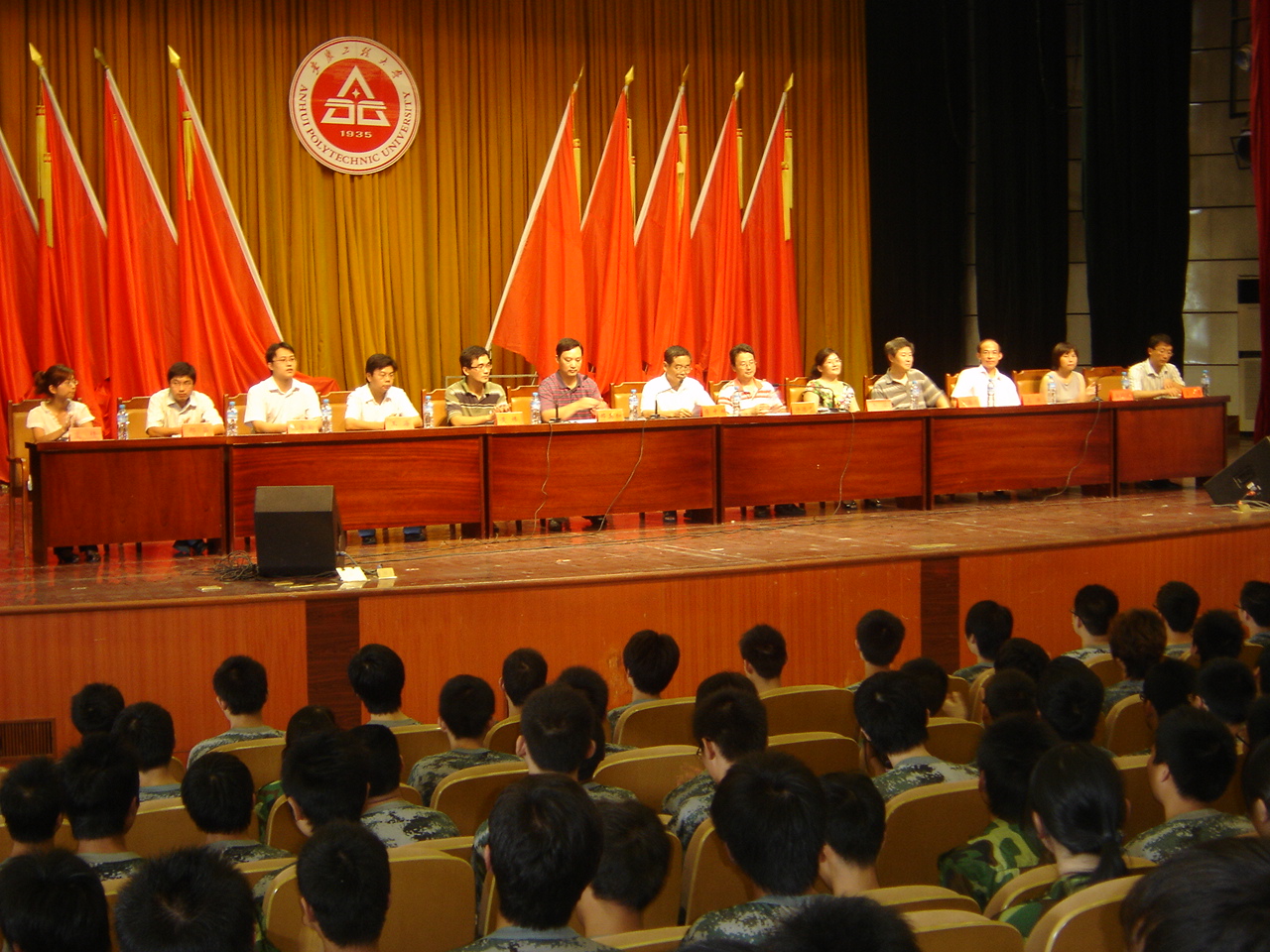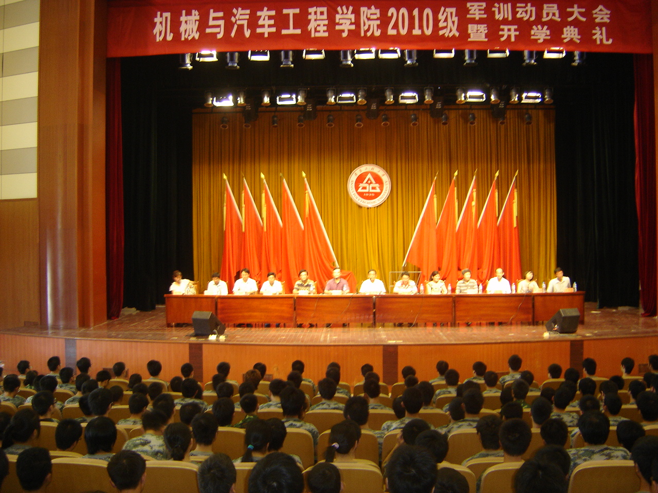 为认真贯彻落实国家对高校大学生的军训要求,加强大学生的思想政治教育,全面提高大学生的综合素质水平,根据学校军训团统一部署,机械与汽车工程学院于917下午2:30在师生活动中心举行2010年军训动员大会暨开学典礼,学院全体领导、学院团委书记、各专业教研室主任、新生辅导员出席本次大会,666名新生参加了大会。大会由学院党委副书记邓英扣主持。