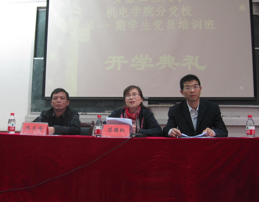 院党委副书记陈其峰在讲话中阐述了举行预备党员培训班的目的和意义并向学员提出了要坚定共产主义理想信念;真正从思想上入党;始终保持共产党员先进性三点希望。最后他要求大家以党员的标准严格要求自己,铭记自己肩负的光荣使命,时刻以胡锦涛总书记提出“勤于学习、善于创造、甘于奉献”的希望勉励自己,努力把自己培养成为能够担当重任、模范带头、不辱使命的合格的共产党员。