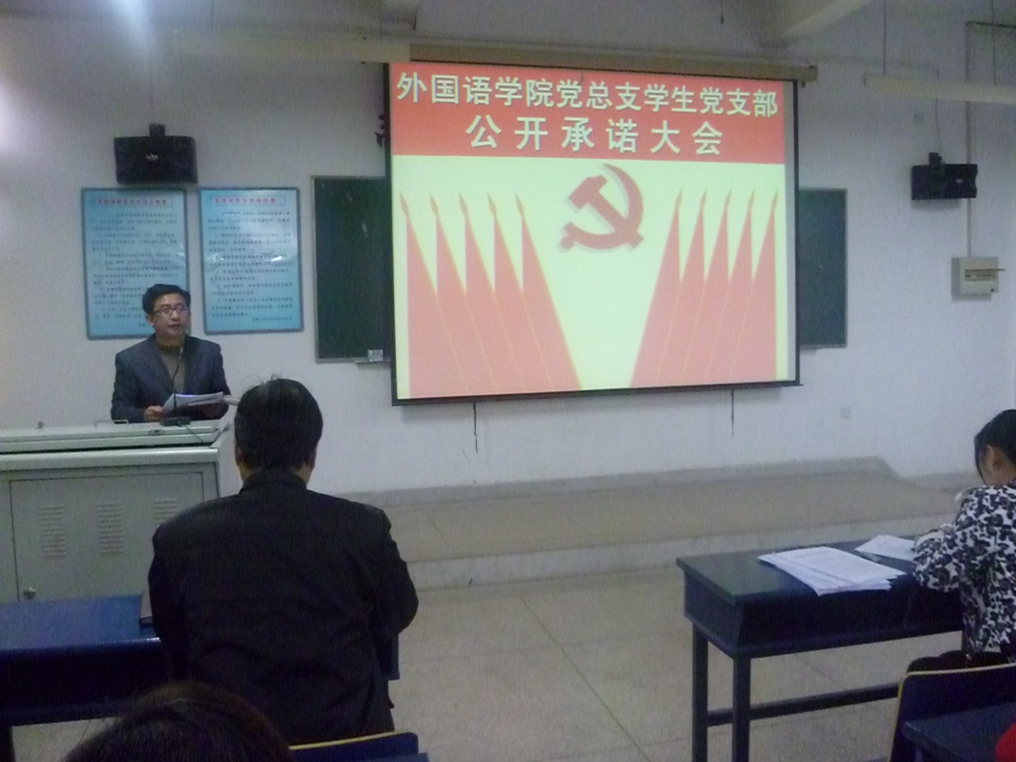 在全党上下开展“创先争优”活动之际,在建党90周年即将到来之时,4月30日下午,外国语学院学生党支部在9教101教室举行了学生党员“创先争优在行动”主题演讲比赛暨“创先争优”党员公开承诺大会活动。院党总支副书记谈丽华,学生党支部书记、团总支书记李烨及全体辅导员出席了此次活动。活动由李烨老师主持。