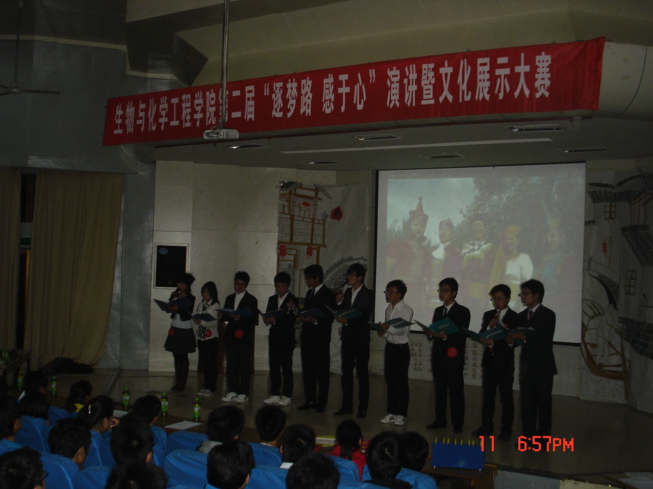 为响应校园文化艺术节的号召,增强同学们的综合素质,生物与化学工程学院特举办第二届“逐梦路感于心”演讲暨文化展示大赛。4月11日晚,决赛在学术报告厅隆重举行。广播站指导老师徐征、该院辅导员查桂义、刘海涛、孙菲老师担任本次大赛的评委。莅临现场的嘉宾和大众评委有该院党委副书记章兵、团委书记董文静以及各兄弟学院学生会主席。