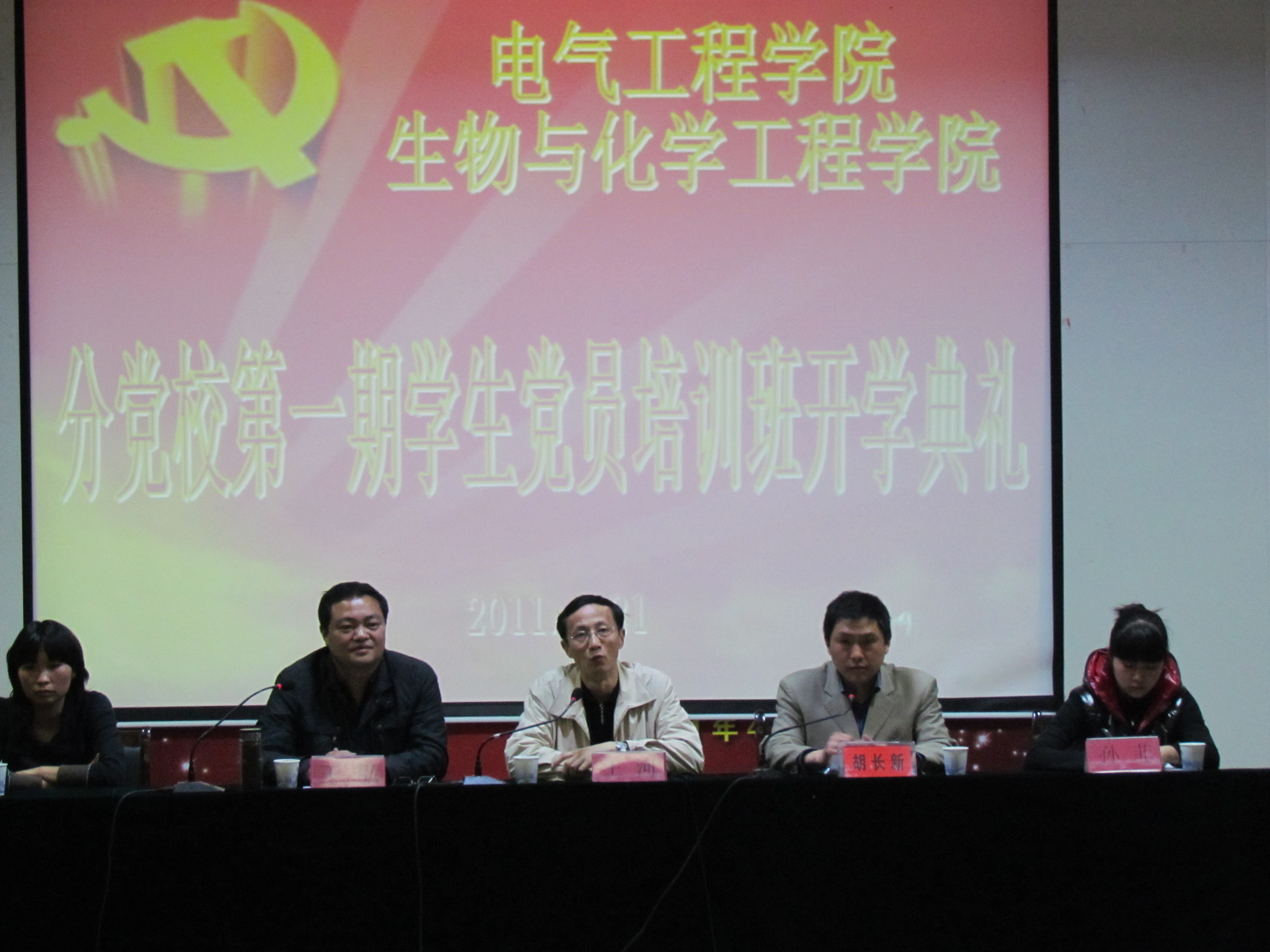 4月21日下午,生物与化学工程学院、电气工程学院分党校第一期学生党员培训班开学典礼在学术报告厅隆重举行。校党委学工部部长、学生处处长王河,生化学院党委书记、院分党校校长王弘,电气工程学院党委副书记胡长新,本期党校两个学院的班主任孙菲、王玲玲出席了开学典礼。典礼由胡长新副书记主持。