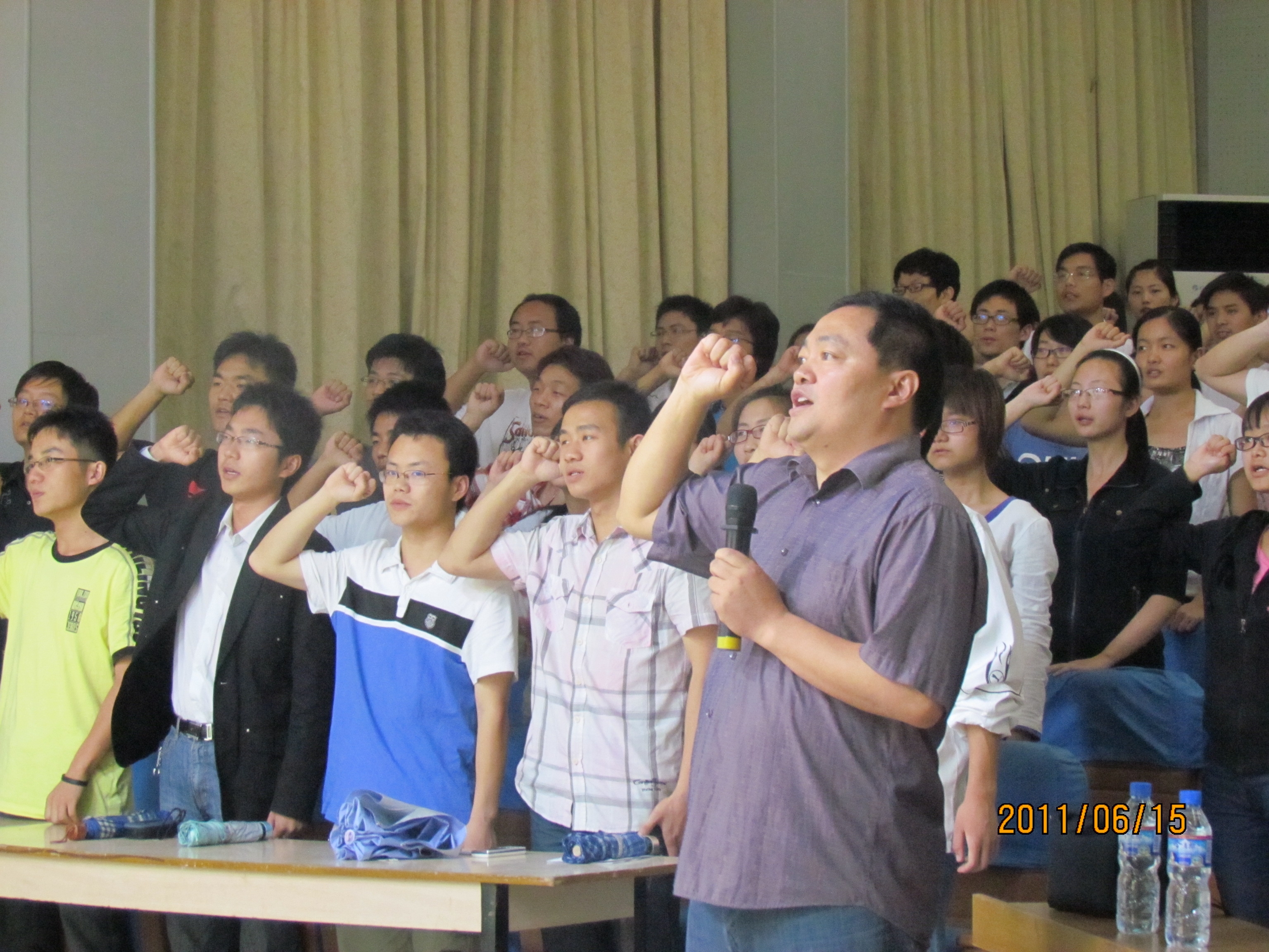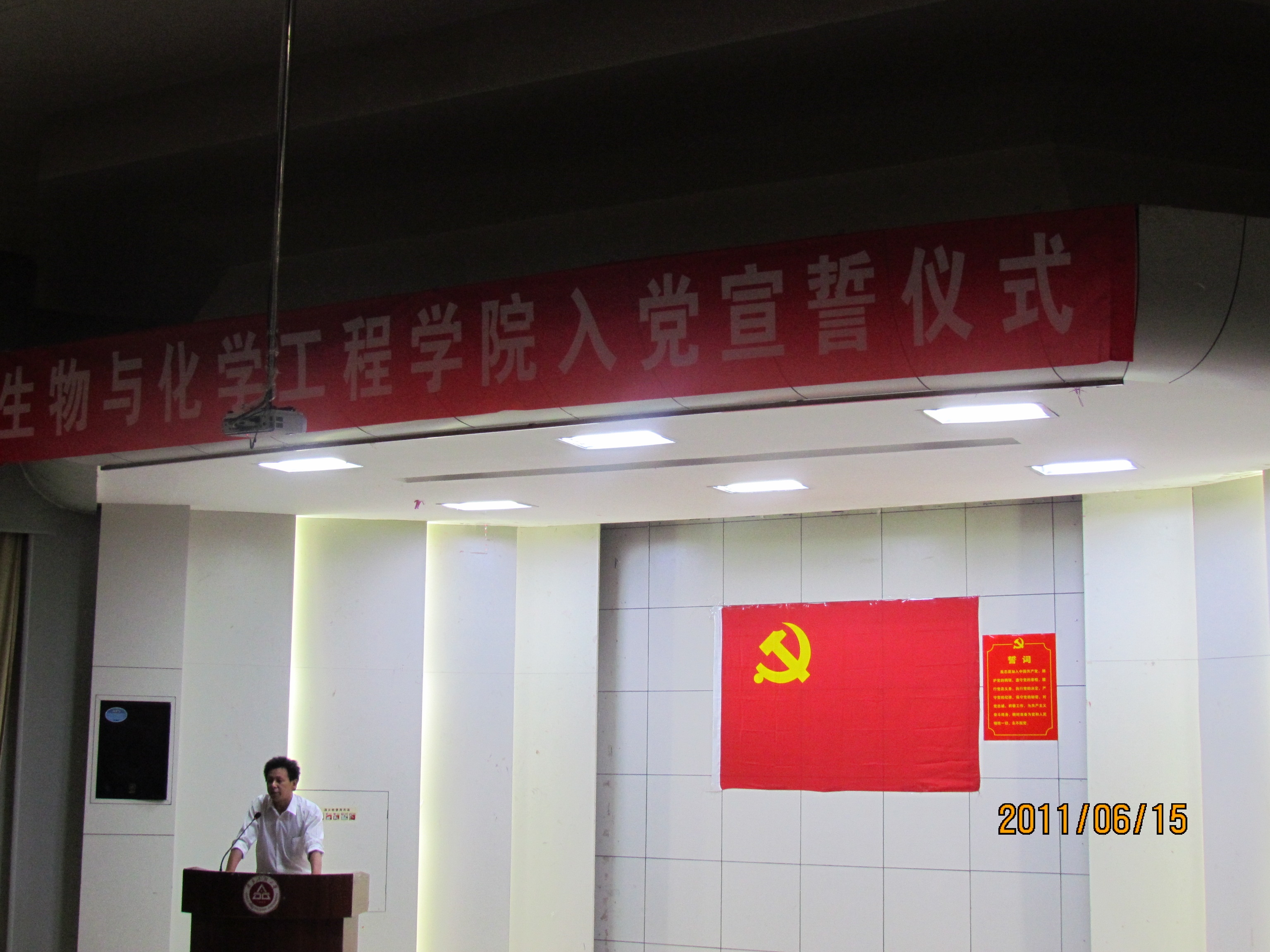 在工作人员宣读新党员名单之后,由王弘领誓,全体党员面对党旗,举起右拳,庄严宣誓:“我志愿加入中国共产党,拥护党的纲领,遵守党的章程……”。随后,新党员代表丁菲同学代表全体新党员向党组织表决心,丁纯梅教授代表老党员向党组织表决心。最后王弘总结讲话,他说,刚刚举行的入党宣誓既是对建党90周年的隆重纪念,也是对新老党员一次深刻的党性教育。他对全体党员提出了希望,第一要立足本职,踏实工作,树立党员的良好形象;第二要牢记宗旨,在工作学习等各方面发挥模范带头作用;第三要加强学习,不断提高政治理论修养;第四要积极进取,创先争优。在学校和上级党组织的正确领导下,珍惜时间,抓住机遇,为学校建设和生化学院的发展做出贡献,向党的90周年诞辰献礼。