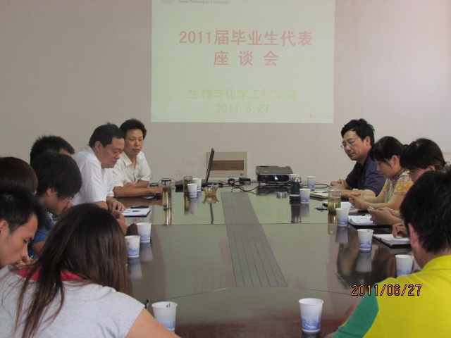 6月27日下午,生化学院在学院会议室召开2011届毕业生代表座谈会,院党委书记王弘、院长徐建平、副院长薛正莲、党委副书记章兵出席了座谈会,来自全院各专业的15名学生代表及毕业班辅导员参加了座谈会,会议由党委副书记章兵主持。