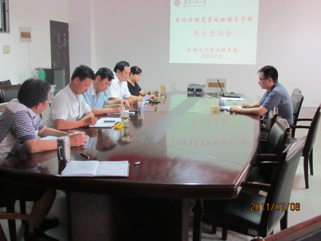 王弘书记首先对我院“以人为本、执政为民”主题教育活动进行了总结汇报。组织全体处级干部学习“关于召开2011年度党员处级领导干部民主生活会的通知”(党组字[2011]17号);按照文件要求,通过以自学为主和中心组集中学习相结合的方式学习相关材料;通过支部和教研室以部门为单位发放生化学院党员处级干部民主生活会征求意见表,并对征求到的意见进行汇总和分类整理,共整理出20多条意见和建议;领导班子成员集体谈心、将意见和建议反馈至每位班子成员,班子成员按要求准备了发言提纲。