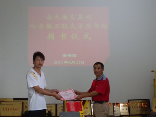 2011年8月31日上午,海天教育集团芜湖地区负责人、我校机电学院电气2091班学生邱鹤翔向图书馆捐赠400余册新书。
