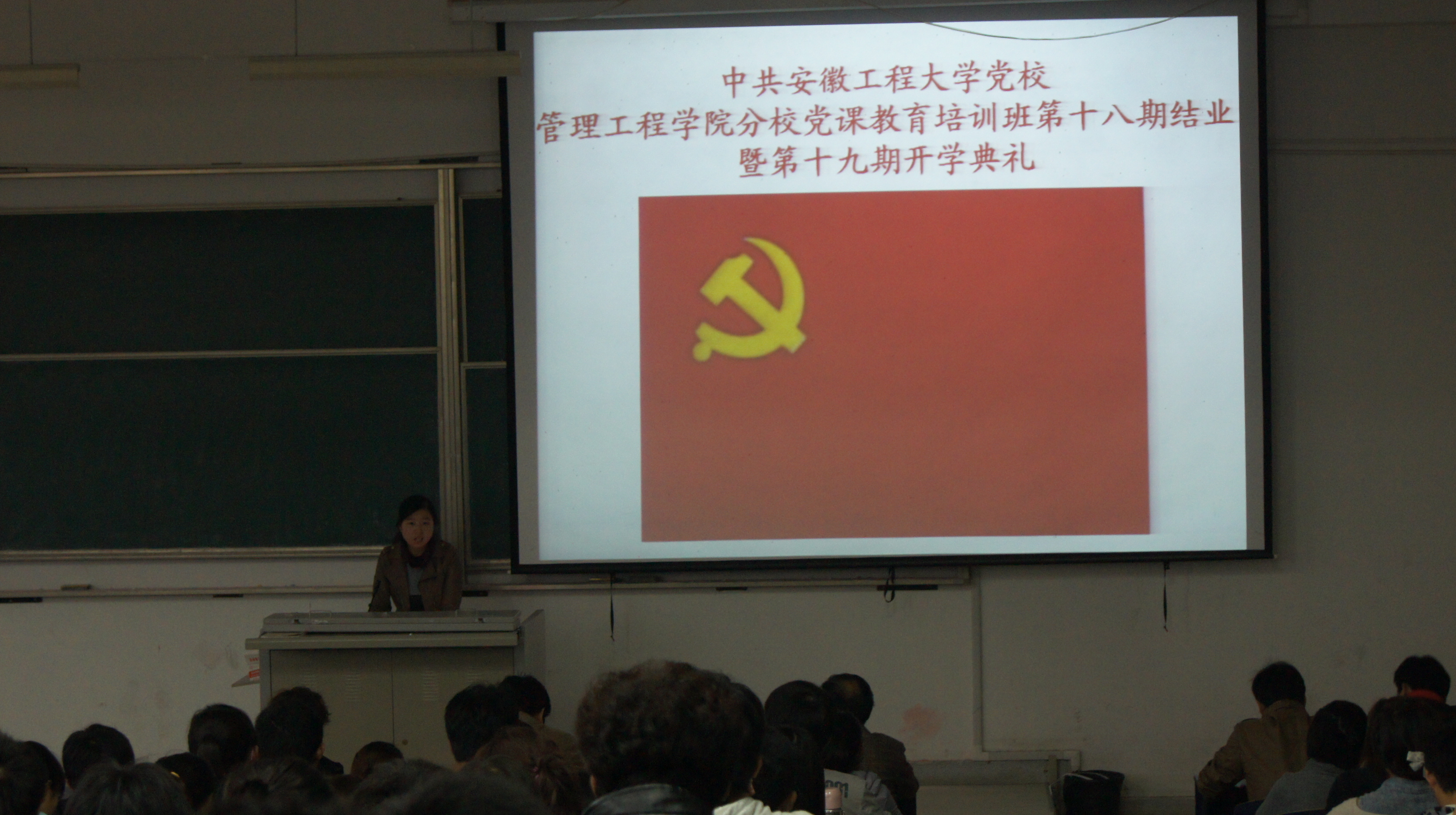 112下午4:30,管理工程学院党校党课教育培训班第十八期结业暨第十九期开学典礼在5117隆重举行。管理工程学院党委书记汪张林老师,学生第一、第三党支部书记黄桂琴、徐晓平老师和第十八期党校班主任沈明领老师出席典礼。第十八期、第十九期党课全体学员参加典礼。典礼由第十九期党校班主任何惠妍老师主持。