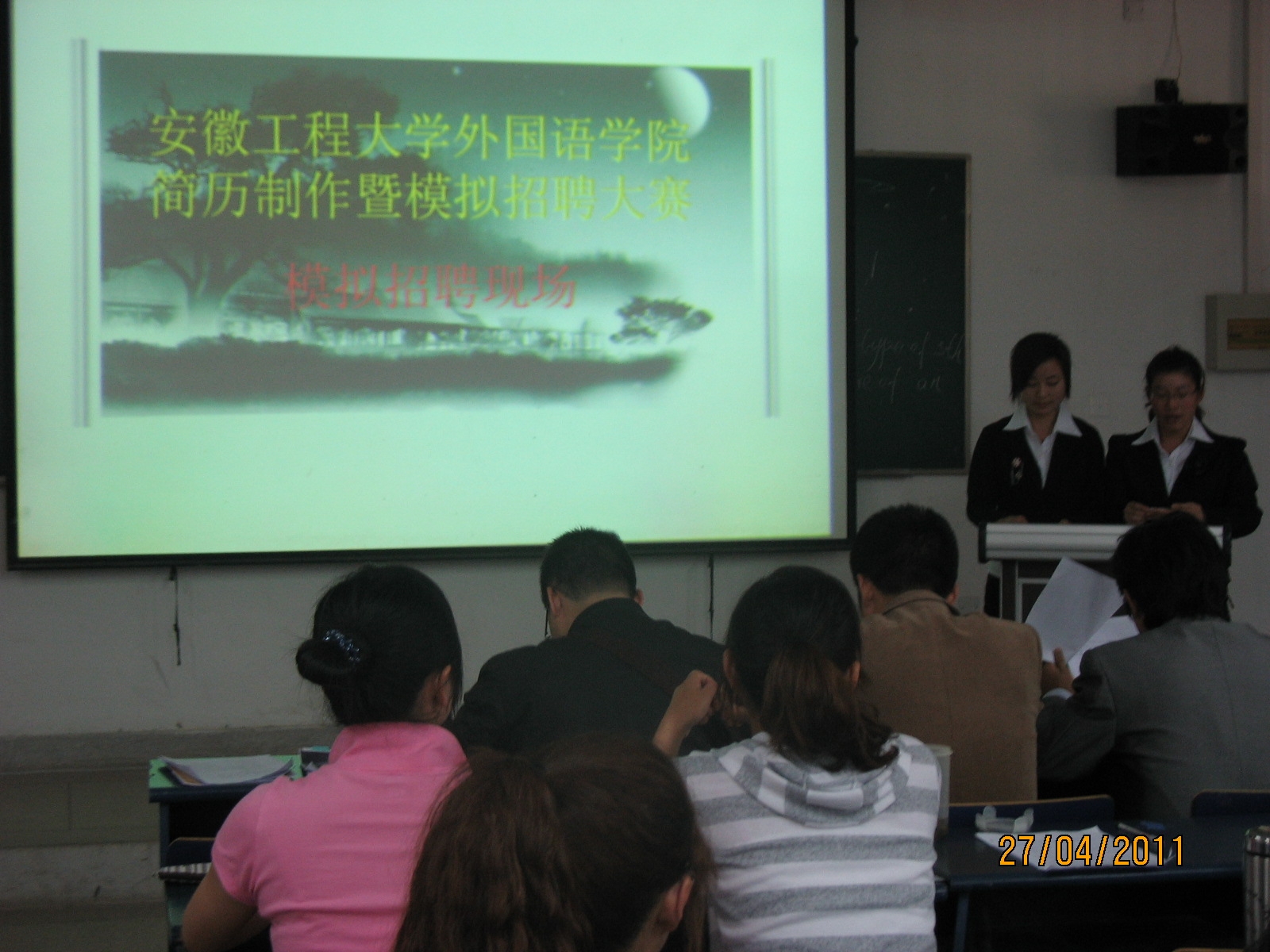 今年上半年,在2012届毕业生乃是大三学生的时候,即开展以走进职场、展示自我、自信起跑为主题的大学生求职简历制作暨模拟招聘大赛,通过简历制作、无领导小组讨论和模拟招聘会等三个环节全方面考察学生的专业知识和综合能力。同时,外国语学院还邀请了学工部部长、学生处处长、就业指导中心主任王河为同学们做了一场题为《精心准备、迎接挑战》的就业指导讲座。通过这次活动,让学生通过亲自求职体验,理论联系实际,掌握就业技巧,居危思安,及早规划。