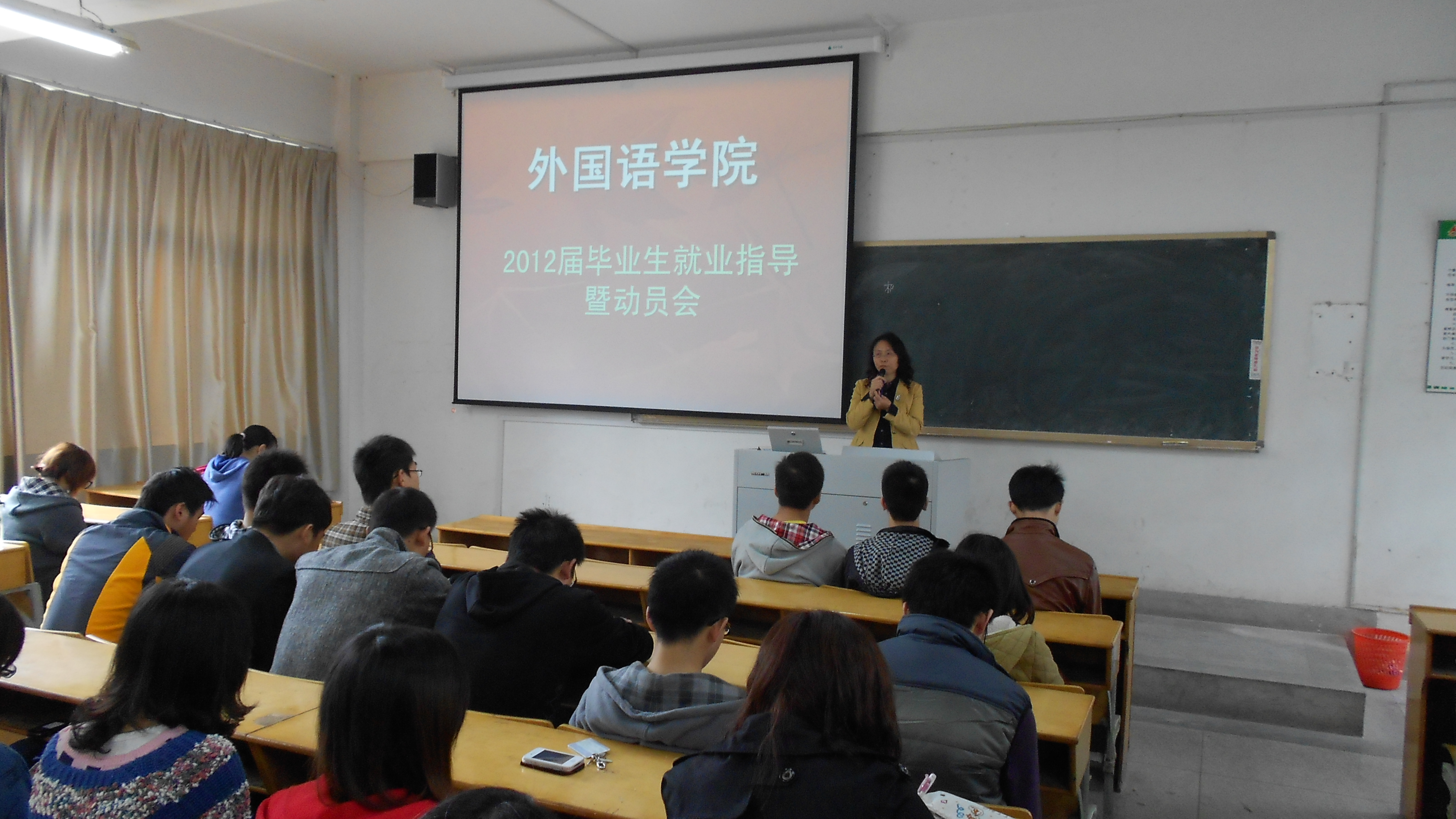 目前,正值就业的最佳时机,为督促2012届毕业生尽早落实就业单位,外国语学院于11174J110又召开了“2012届毕业生就业指导暨动员会。会上,院党总支副书记谈丽华分析了当前的就业形势,希望同学们主动出击,积极就业,特别指出外国语学院女生较多,女生在就业中相对弱势,要有紧迫感。谈书记结合自身人事工作的经验,详细分析了用人单位选拔人才的标准,指出同学们在应聘中应该注意的细节问题,教导同学们要学会突出自身的闪光点,在百万求职大军中脱颖而出。她还强调要注意就业安全,防止就业陷阱和诈骗。同时,她也要求考研的同学们坚定信心,心无旁骛,做最后的冲刺!此外,谈书记还要求毕业班的同学们正确的处理好就业与学业的关系,她指出:大学四年是积累的过程、是能力培养的过程,在最后的学习生活中,要严格要求自己,全面提升自己的综合素质,为今后的发展夯实基础。毕业班辅导员余本祺从就业形势、就业政策、基层就业、就业程序、就业心理及调试等几个方面进行了详细的指导。她通过大量的就业案例分析了同学们在就业的各个过程中可能遇到的种种问题,列举了同学们在就业时出现的各种心理状况并逐一给出了建议。她要求大家牢牢抓住年底的就业高峰期,准确定位、坚定信心、全面考虑、果断签约。