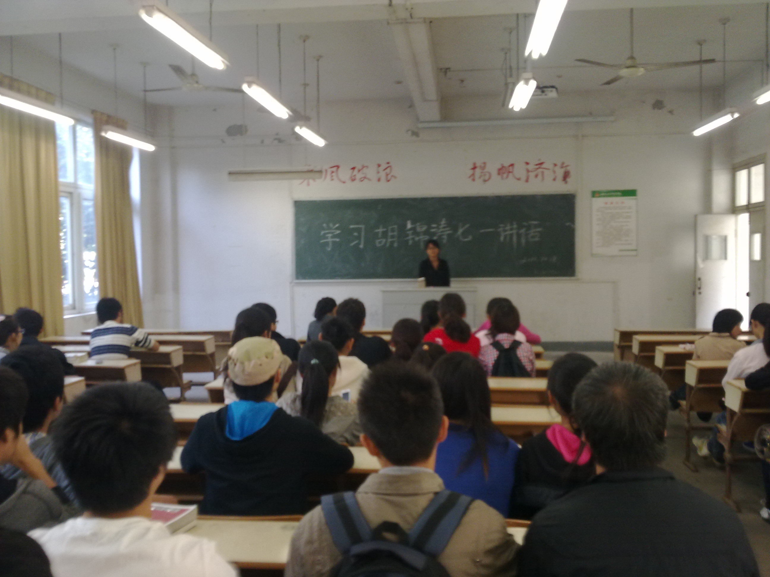 10月3日上午,国贸102班在6J311召开了以学习锦涛总书记“七一”重要讲话精神为主题的主题班会。大家积极讨论,该班团支书王淑贞在会上积极倡导各位同学学习各方面的知识,增加知识储备,加强与同学之间的交流。10月7日,营销102班在2教203召开了学习“七一”讲话主题班会,团支书蒋超亚带领大家认真学习,各位都充分领悟到讲话精神的实质作用与重要性,并积极参与思考怎样将讲话精神与我们的实际生活相结合,发挥其实际作用。10月18日,工商111在5教112召开了主题班会,主要内容是学习胡锦涛总书记的“七一”重要讲话,强调作为一名共青团员,大家应牢记党的教导,将学习科学文化知识与思想教育相结合,从自己做起,从小事做起,永葆团的活力,各位同学认真做笔记并积极讨论。全院其他各团支部也以不同形式组织开展了学习活动。