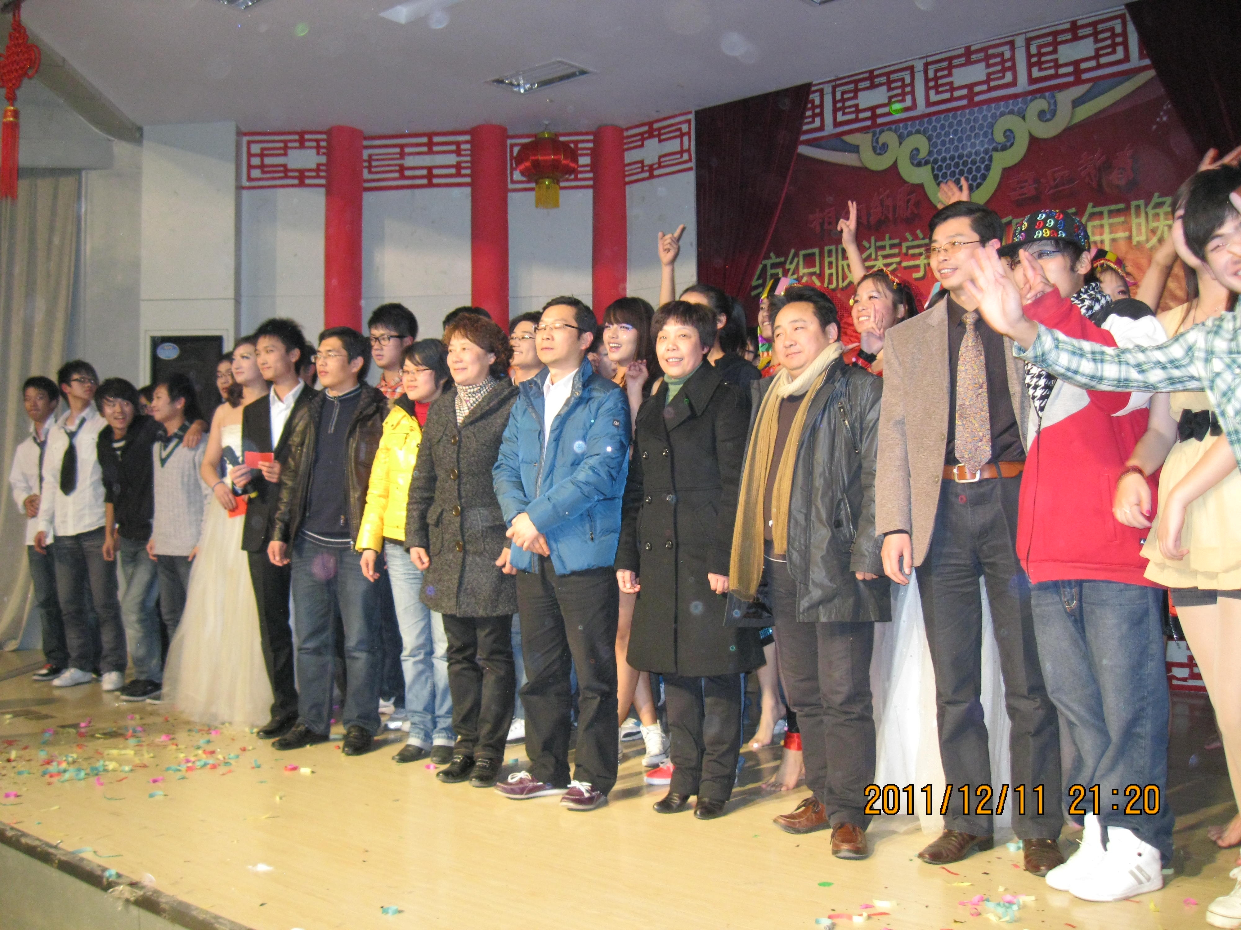 2011年12月11日晚7点,纺织服装学院“相约纺服 喜迎新春”2012年迎新年晚会在学术报告厅隆重举行。出席晚会的嘉宾有芜湖点石地产咨询有限公司董事长李卫民、芜湖双成文化传媒有限公司总经理高成、院党委书记余新霞、院长毕松梅老师、院党委副书记刘金斌、院团委书记李校林、辅导员李恒奎、裘秀群、洪飞和服装设计专业教师蔡沐芳等。