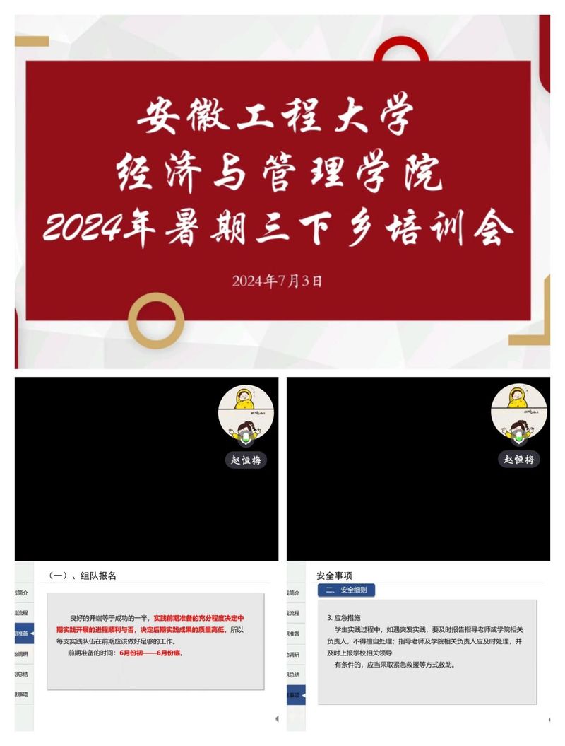 本网讯 为积极响应国家号召,提升学生参与暑期“三下乡”活动的实践能力和服务水平,经济与管理学院于7月3日在线上举行暑期“三下乡”实践活动培训会。会议由学院团委书记赵恒梅主持,学院团学骨干、“三下乡”社会实践队伍负责人等共同参加。