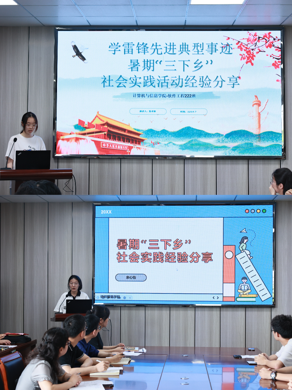 2024年校学雷锋先进典型事迹获得者软件222张卓妍、2023年度“圆梦工程”志愿服务项目负责人纺织213余心怡结合自身社会实践经历,分享了自己开展社会实践活动的心得体会,重点围绕项目选题、实施开展、宣传报道和成果总结等方面进行了经验分享。