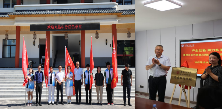 参会领导共同为社会实践团队授旗。何定柱、徐珍珍共同为“劳动实践基地”揭牌。