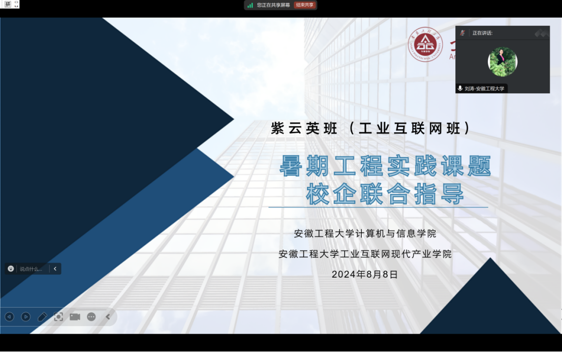 本网讯 8月8日,紫云英班(工业互联网班)暑期工程实践课题校企联合指导活动在线上举行。本次活动由计算机与信息学院、工业互联网现代产业学院主办,副院长刘涛、计算机应用研究所所长刘三民、物联网工程系主任章平、安徽共生物流科技有限公司解决方案经理尚贤慧、物流业务经理孙乐、产品经理叶波、紫云英班(工业互联网班)全体学员以及相关师生参加会议。