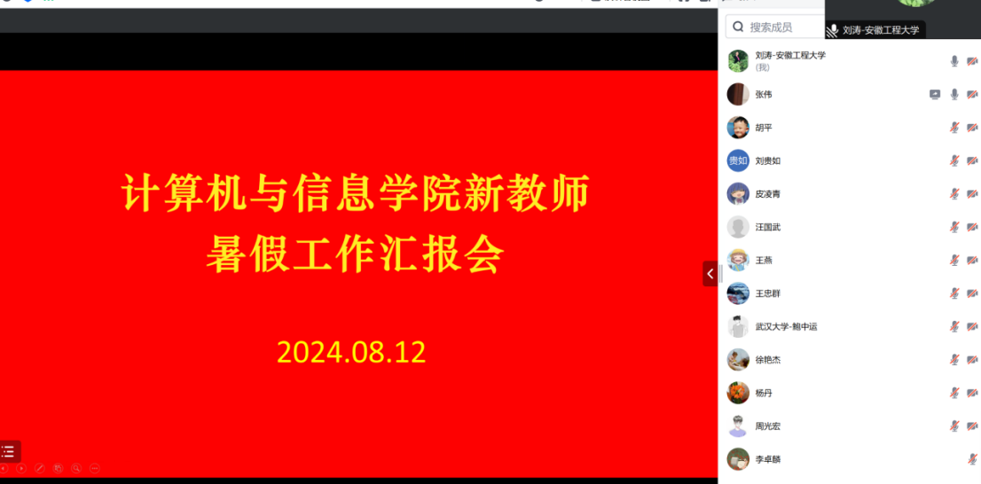 本网讯 为进一步提高教师教学能力和教学水平、让新教师更好地融入学院教学科研环境、促进新老教师之间的互动和交流、加速新教师成长,计算机与信息学院于8月12日举办了线上“新教师暑期工作汇报会”,会议由学院副院长刘涛主持,督导组教师、2024年新入职教师参加了本次会议。