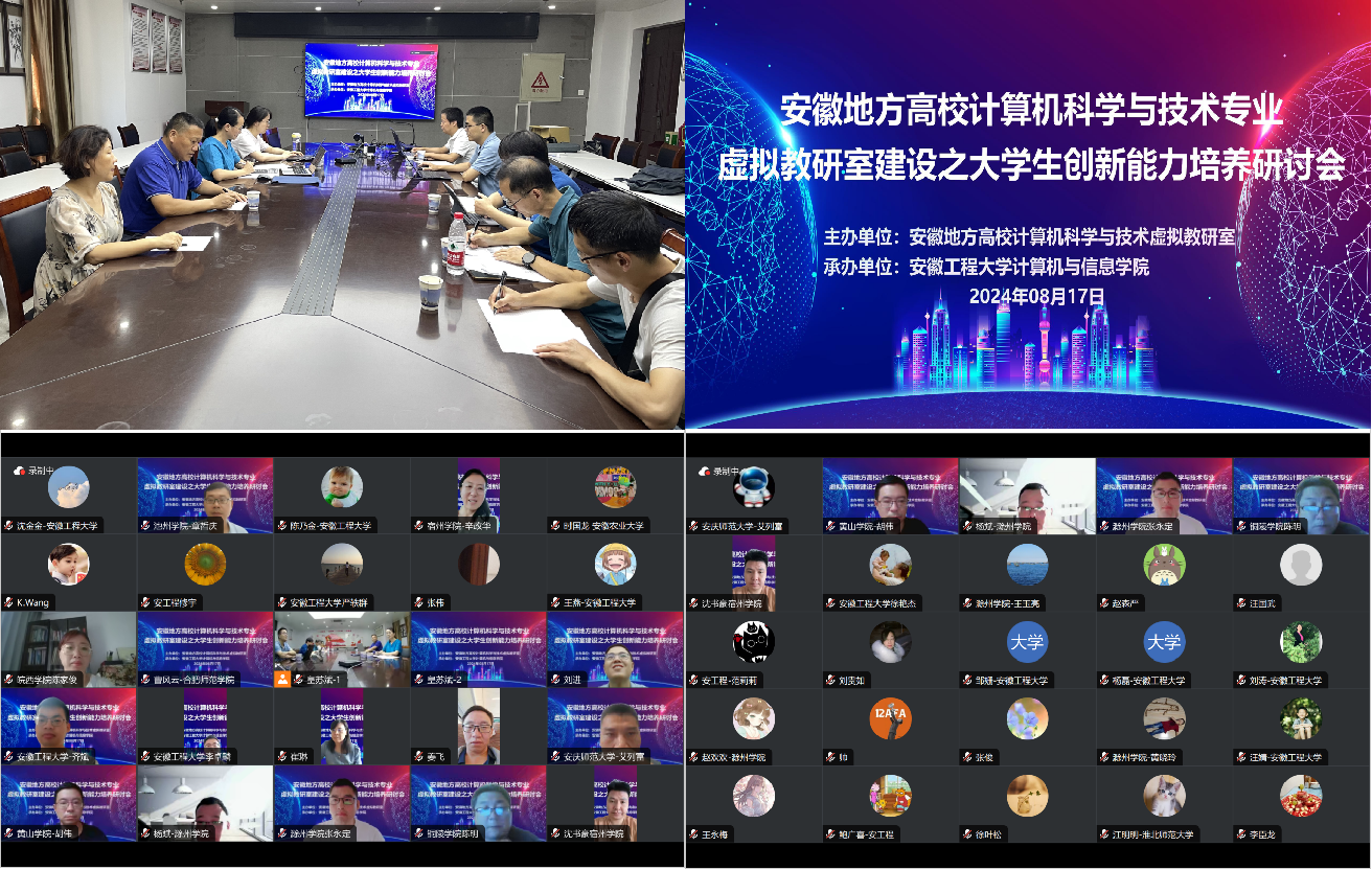 本网讯 为统筹推进科技、教育与人才战略支撑工作,着力提升计算机类本科生人才培养质量及其创新创业能力,8月17日,计算机与信息学院组织举办了“安徽地方高校计算机科学与技术虚拟教研室建设之大学生创新能力培养研讨会”。来自安徽农业大学、淮北师范大学、安庆师范大学、合肥师范学院、宿州学院、滁州学院、黄山学院、皖西学院、池州学院、铜陵学院、巢湖学院等高校计算机学院负责人、专业负责人或骨干教师共50多位来宾通过线上线下相结合的方式参加了此次会议,会议由计算机科学与工程系副主任刘进主持。