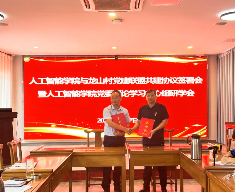本网讯 为强化党纪意识,提高党建工作质量和效率,8月27日,人工智能学院与南陵县何湾镇龙山村在龙山学院开展党委理论学习中心组研学会暨党建联盟共建协议签署会。人工智能学院党委理论学习中心组成员、龙山村“两委”及党员代表、龙山村驻村工作队成员等参加会议,会议由人工智能学院党委书记任家钱主持。