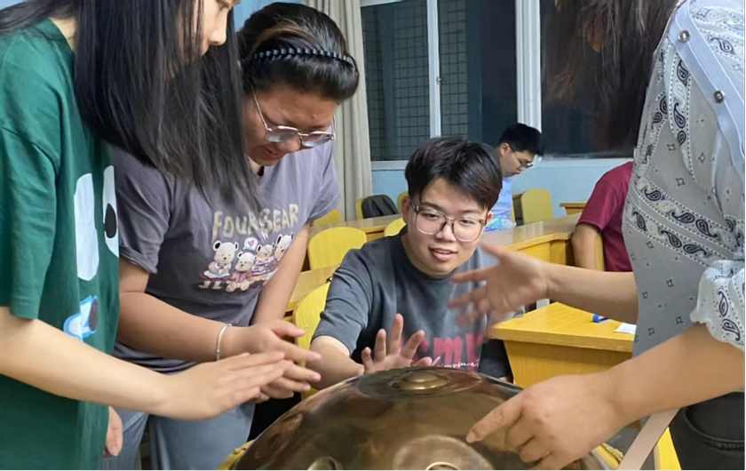 该课程由王小元、张海敏、程瑶等多位教师共同开发,团队成员均有多年的艺术类课程授课经验,2位老师参加中国科学院的心理咨询师培训,具备了一定的心理咨询技能,2位教师接受了系统的音声疗愈教育培训。课程实操部分主要有3个模块:第一模块音声疗愈,以水晶钵、手碟等疗愈乐器的学习演奏及即兴演唱为主要内容,原理是通过声波的振动产生与身体的共振调频;第二模块舞动疗愈,通过感知身体,专注于节奏旋律,尝试并跟随个体的感知,完成觉之舞动。通过观察、模仿等游戏设置体验感受他人的觉知,从而提高团体意识及相互支持的发生;第三模块绘画疗愈,通过观察自然,描绘自然界中植物的缠绕现象,通过自由联想描绘和谐完整的曼陀罗绘画,以及通过房树人绘画探讨情绪的来源等。同时,教师在授课过程传播了很多疗愈小技巧给同学们如蝴蝶拍、正念、渐进式肌肉放松等,希望同学们可以自主地在日常生活中学习使用。