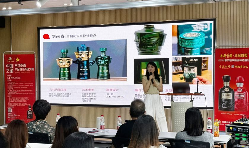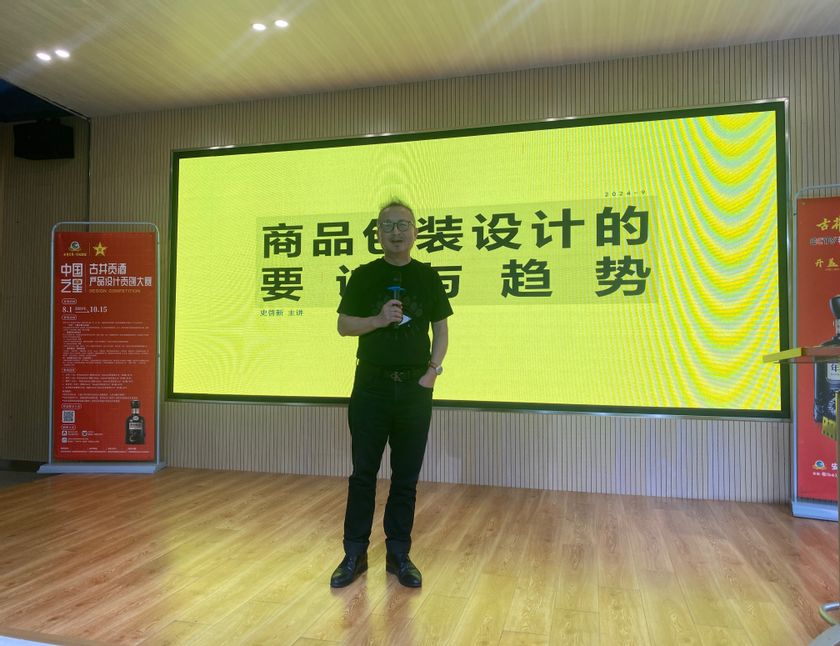 视觉传达设计专业张翠老师从专业视角并结合自己的设计经验,向大家展示了多个白酒包装获奖案例,深入讲解了白酒包装设计的关键要素,展望了白酒包装设计的未来趋势。古井贡酒产品设计部经理吴瑞向大家介绍了公司的企业文化,并对大赛主题和投稿要点进行了详细解析,为同学们参赛提供了明确指导。中国包装联合会设计专业委员会全国常委史启新教授分享了商品包装设计的精髓和潮流方向,他强调将人性化与自然环境融入设计之中,鼓励创新思维和运用新材料,展现自己的设计才能。