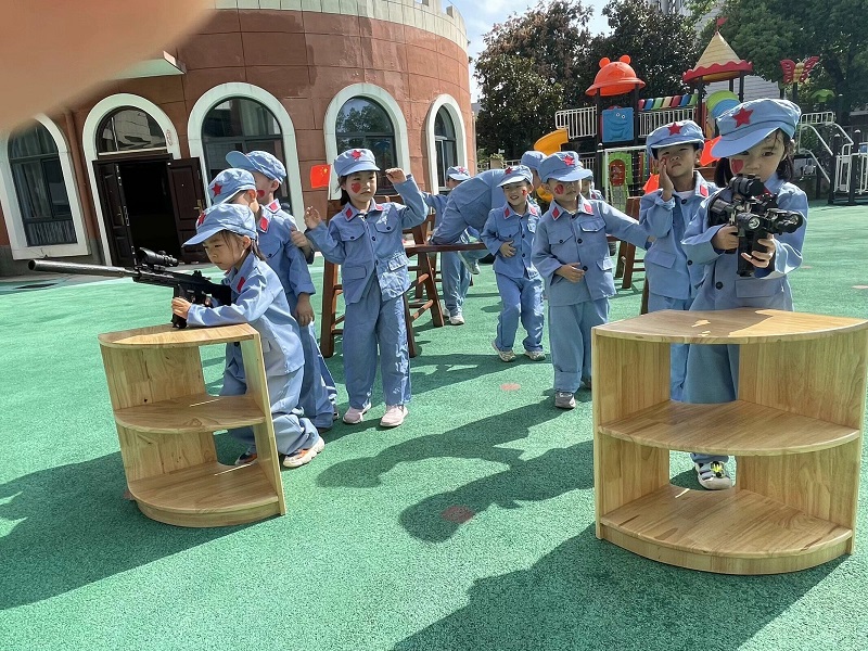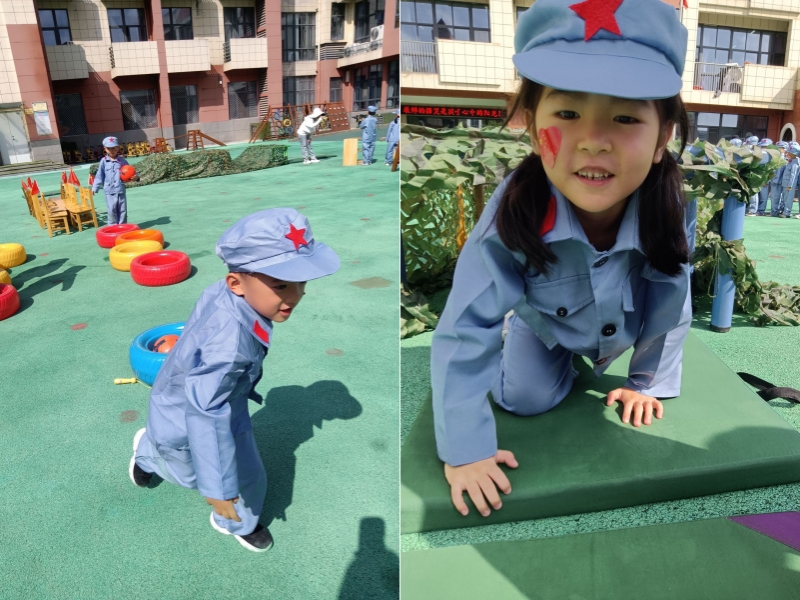 大班开展 “我是小红军,重走长征路”活动。孩子们身着红军服,根据场景设计听口令按路线完成了“长征”体验。有“飞夺泸定桥”“穿越火线”“爬雪山”“过草地”“运输粮食”等,小“红军”们跨越重重障碍,脚步一刻也未停留,争先恐后奔向目的地,他们的身影穿梭在操场上、跑道上,尽管汗水打湿了衣衫,也没有一个孩子叫苦叫累。孩子们在游戏中追红色记忆、寻红色足迹、承红色精神,在磨炼自身意志中感受长征精神,感悟红色文化,激发爱国之情。