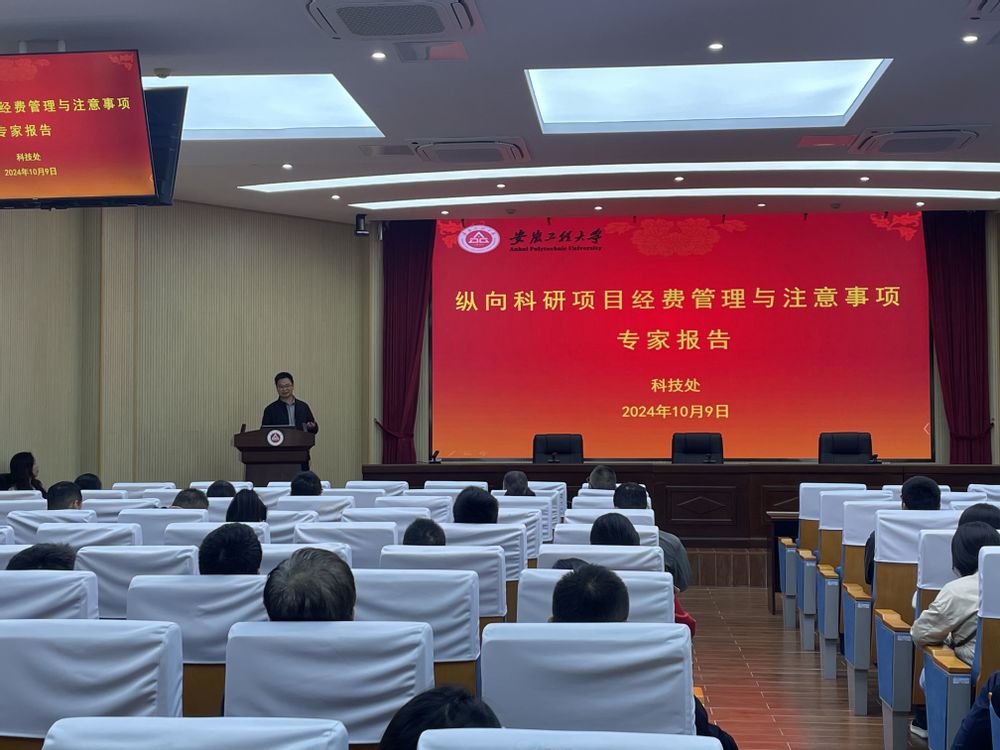 本网讯 为持续做好科研项目的规范化管理,10月9日,科技处在行政楼A座104会议室召开了“纵向科研项目经费管理与注意事项”专家报告会,会议邀请了安徽新中天会计师事务所主任、高级会计师杨晶开展专题报告,各学院在研市级及以上纵向科研项目负责人参会。会议由科技处副处长王勇主持。
