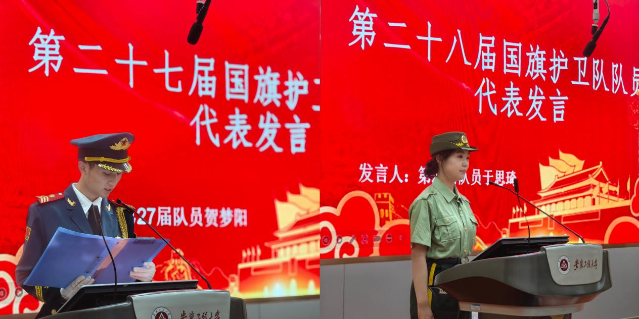 第二十七届国旗护卫队代表贺梦阳回顾了一年来汗水浇灌的成长之路,他们将继续守护国旗的尊严,助力新一届队员的成长。第二十八届国旗护卫队代表于思琦在发言中坚毅地承诺,将接棒前行,以青春的热情守护国旗的梦想。于思琦代表全体成员宣读誓言。