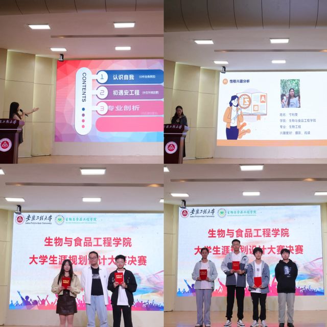 本网讯 为全面贯彻党的二十届三中全会精神,帮助和引导新生结合社会实际需求规划好大学生涯,在人生新起点迈好坚实一步,扣好大学第一颗扣子,10月19日,生物与食品工程学院在学术报告厅举办了新生大学生涯规划设计大赛决赛。学院党委副书记王彦青,食品系教师、团委负责人、辅导员、参赛选手以及各年级学生代表参与此次比赛。经现场评审,食品242王长宝等两名同学荣获一等奖,生制242朱昌玲等四名同学荣获二等奖,生工241寸利雯等六名同学荣获三等奖。