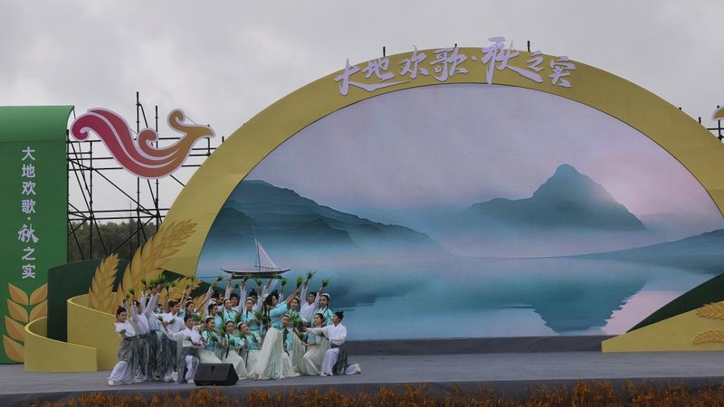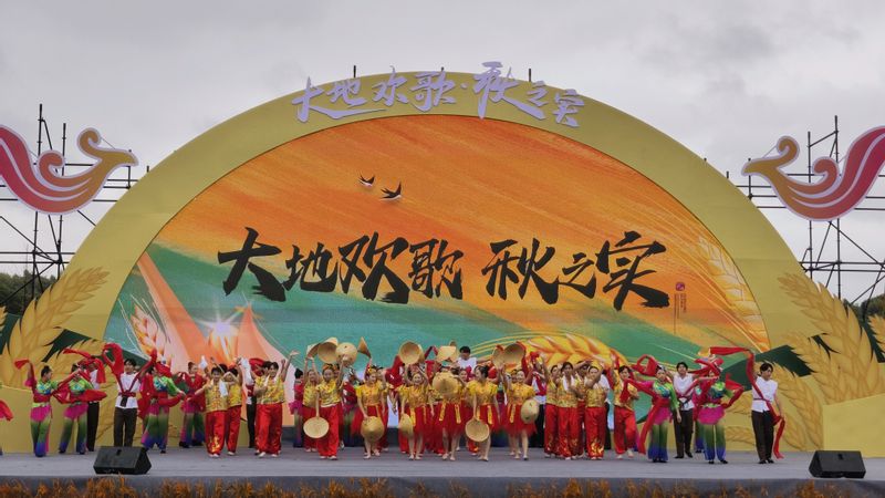 活动中,由体育学院学生演出的原创舞台剧《何以鸠兹》通过鼓乐、歌舞、情景演绎、古今对话、情景朗诵等形式,对“鸠兹楚地”进行文化探源,提炼时代元素“鸠兹-农耕文明-鱼米之乡-现代农业”,沉浸式演绎这段历史变迁和农耕文化传承,描绘着花桥镇的古韵与丰收的交融,展现花桥镇和美、丰收与共富的幸福图景。