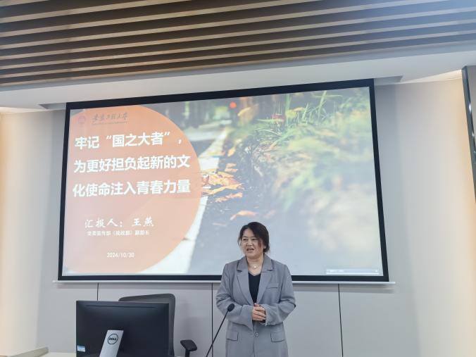 开班仪式结束后,校党委宣传部副部长王燕以《牢记“国之大者”,为更好担负起新的文化使命注入青春力量》为题,给学员们上了精彩的“开班第一讲”。