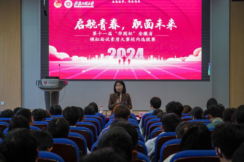 本网讯 11月2日,第十一届“华图杯”安徽省模拟面试大赛校内选拔赛决赛在5J117落下帷幕。校团委副书记周海林、校团委兼职副书记(学生)段文、华图学科教研室组长曹亚南、安徽华图教育芜湖分校校长陶策、校学生会秘书长孙琳瑶担任嘉宾评委,200余名学生来到现场观摩比赛。
