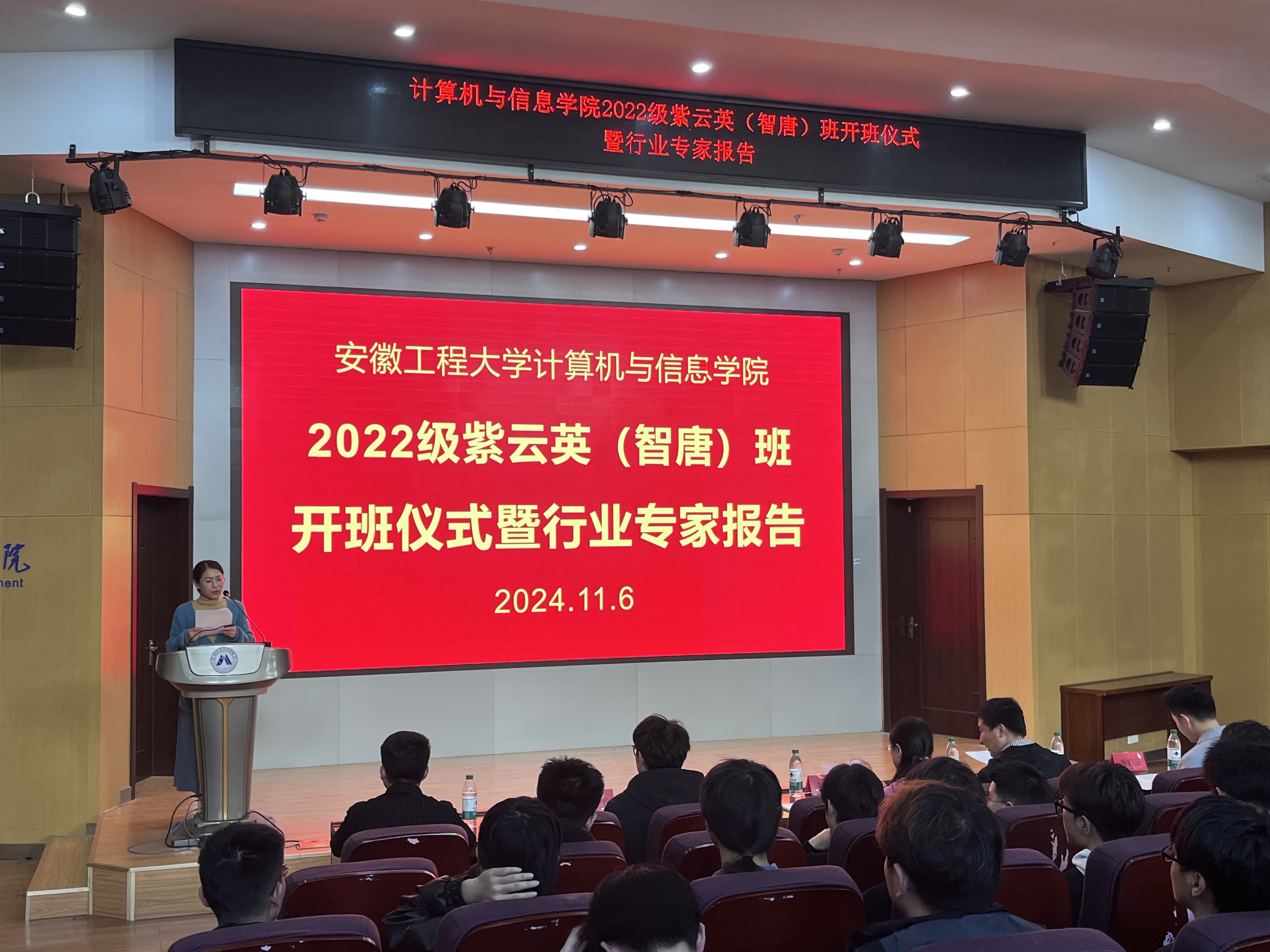 本网讯 11月6日,计算机与信息学院与智唐科技有限公司联合共建的紫云英(智唐)班行业报告暨开班仪式在我校C座七楼报告厅举行。开班仪式由计算机学院副院长刘涛主持,芜湖智唐科技有限公司(简称智唐科技)总经理夏雨昊、市场运营部总监齐泰宇来我院参加仪式,计算机与信息学院物联网工程专业系主任章平、系副主任包象琳、教师季昭康、研究生代表及紫云英(智唐)班全体学员和部分物联网协会同学参加了开班仪式。