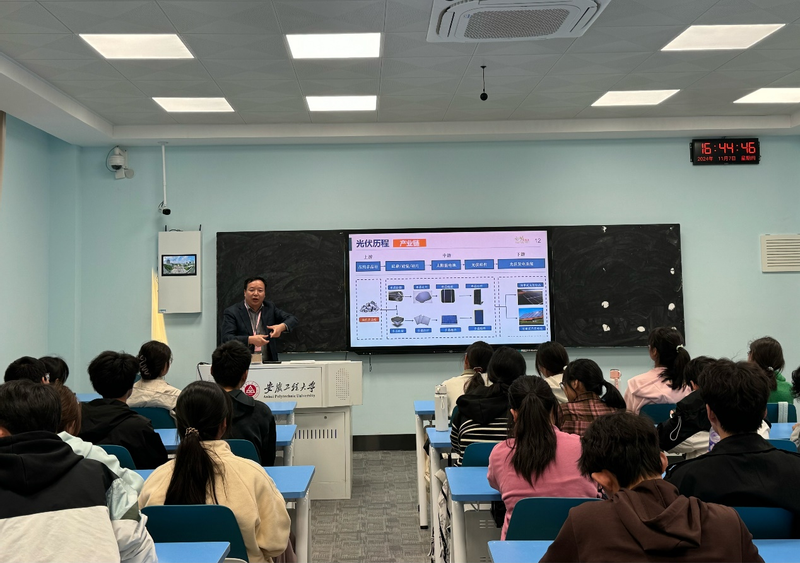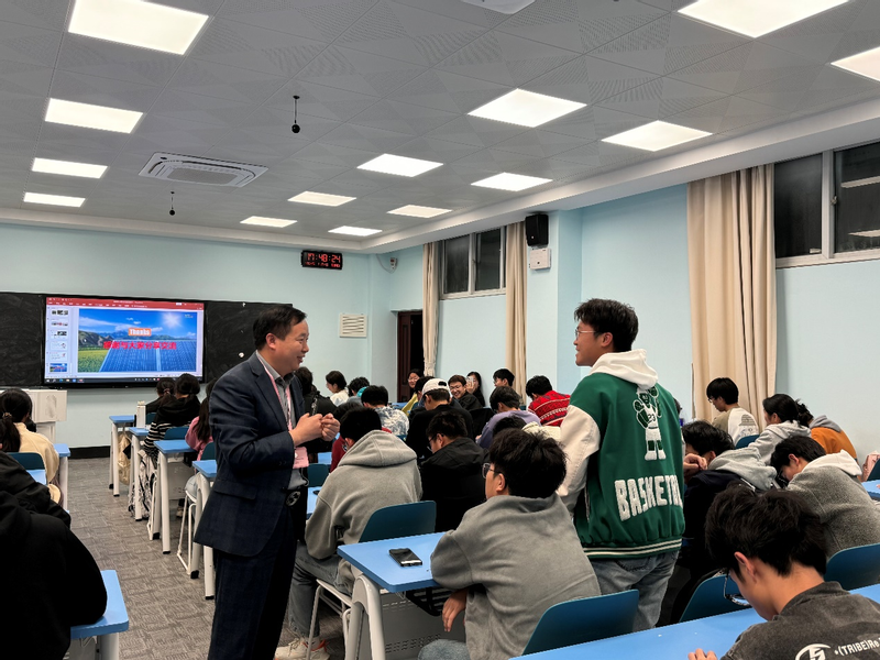 王晶从光伏的早期历史、我国光伏产业演进历史导入,详细介绍了光伏产业链、硅料、硅片、电池片、国家产业政策、发电原理、特点、发展现状等方面情况以及自身在光伏行业的创业经历,娓娓道来,引人入胜。他向同学们现场展示公司产品——硅片,引起同学们极大的兴趣,生动的汇报引得现场掌声不断。他鼓励同学们在大学期间培养学习、规划、思考、人际关系的能力,努力为我国光伏事业添砖加瓦。互动交流环节,同学们踊跃提问“硅片这么薄是怎么生产出来?”“创业过程中有没有特别难忘的经历”……王晶耐心解答同学们提出的问题,现场氛围异常热烈,充分展现了学生们对新能源材料领域及光伏产业浓厚的探索欲与求知欲。