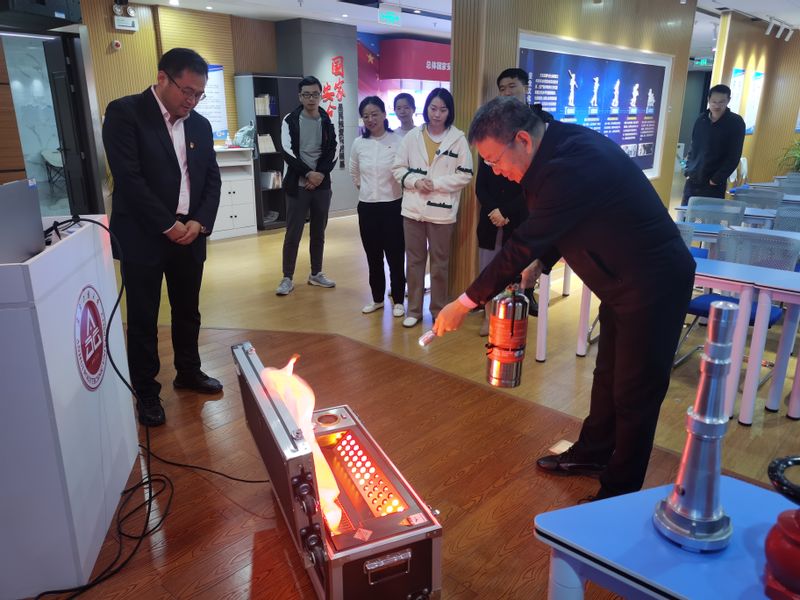 在讲解员的带领下,依次学习了总体国家安全观、北斗卫星导航系统、国防军事装备,观摩了AED自动除颤训练仪、心肺复苏、海姆立克、结绳、灭火器、消防栓等实训教学项目。在保卫处李岗老师的指导下,大家现场演练了灭火器的使用(提拔握压)、消防栓的接管等操作。通过安全知识学习及实地演练,切实增强了党员们的安全意识,提升了应急处置的能力。