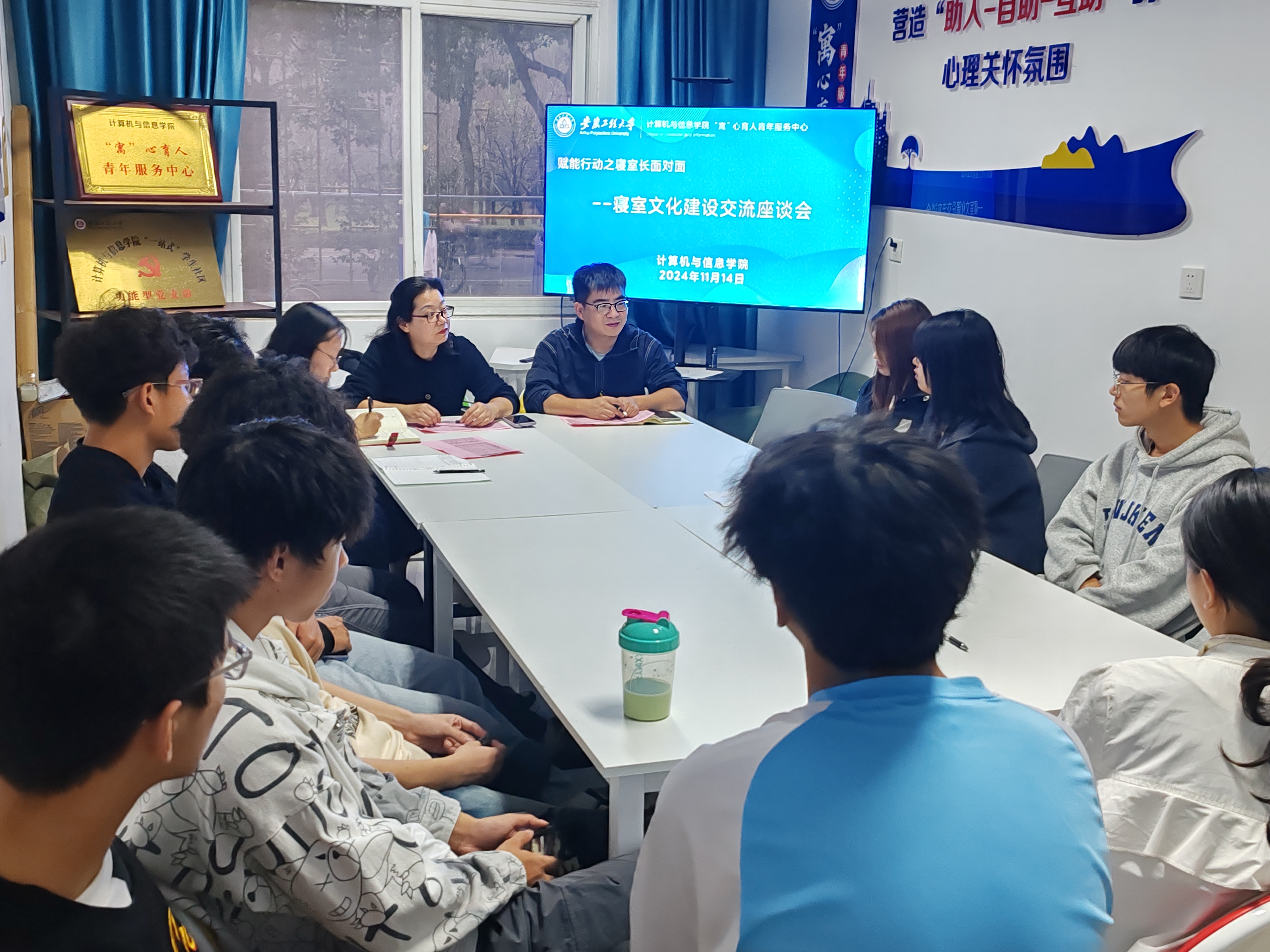 本网讯 为深入学习宣传贯彻习近平总书记考察安徽重要讲话精神,进一步落实落细学校“三全六专”育人实践,加强学院学风建设和寝室文化建设,11月14日,计算机与信息学院在“寓”心育人青年服务中心围绕寝室文化建设为主题开展交流座谈会。党委副书记孙德茹、学院团委负责人孙力力、学生功能型团支部团员代表、2023级和2024级寝室长代表参加。