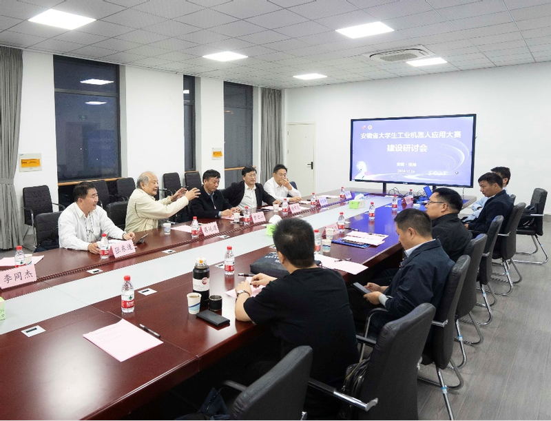 本网讯 11月16日-17日,人工智能学院在机器人现代产业学院组织召开安徽省大学生工业机器人应用大赛建设研讨会。中国科学院合肥物质科学研究院葛运建教授、合肥工业大学曾亿山教授、安徽理工大学张东速教授,南京信息工程大学谢荣见教授、安徽科技学院机械工程学院副院长(主持工作)李同杰、合肥大学先进制造工程学院副院长胡国华、南通大学机械工程学院副院长姚建南、安徽南博智能环境装备股份有限公司总经理陈利、芜湖行健智能机器人有限公司常务副总经理王钰琳、埃夫特智能装备股份有限公司产品开发总监刘凯、芜湖之优轴承有限公司技术部部长房贵保、安徽华东光电技术研究所总工艺师江祝苗、工业和信息化部电子第五研究所芜湖实验室主任涂志健等高校企业专家参加会议。研讨活动由人工智能学院副院长刘玉飞主持。