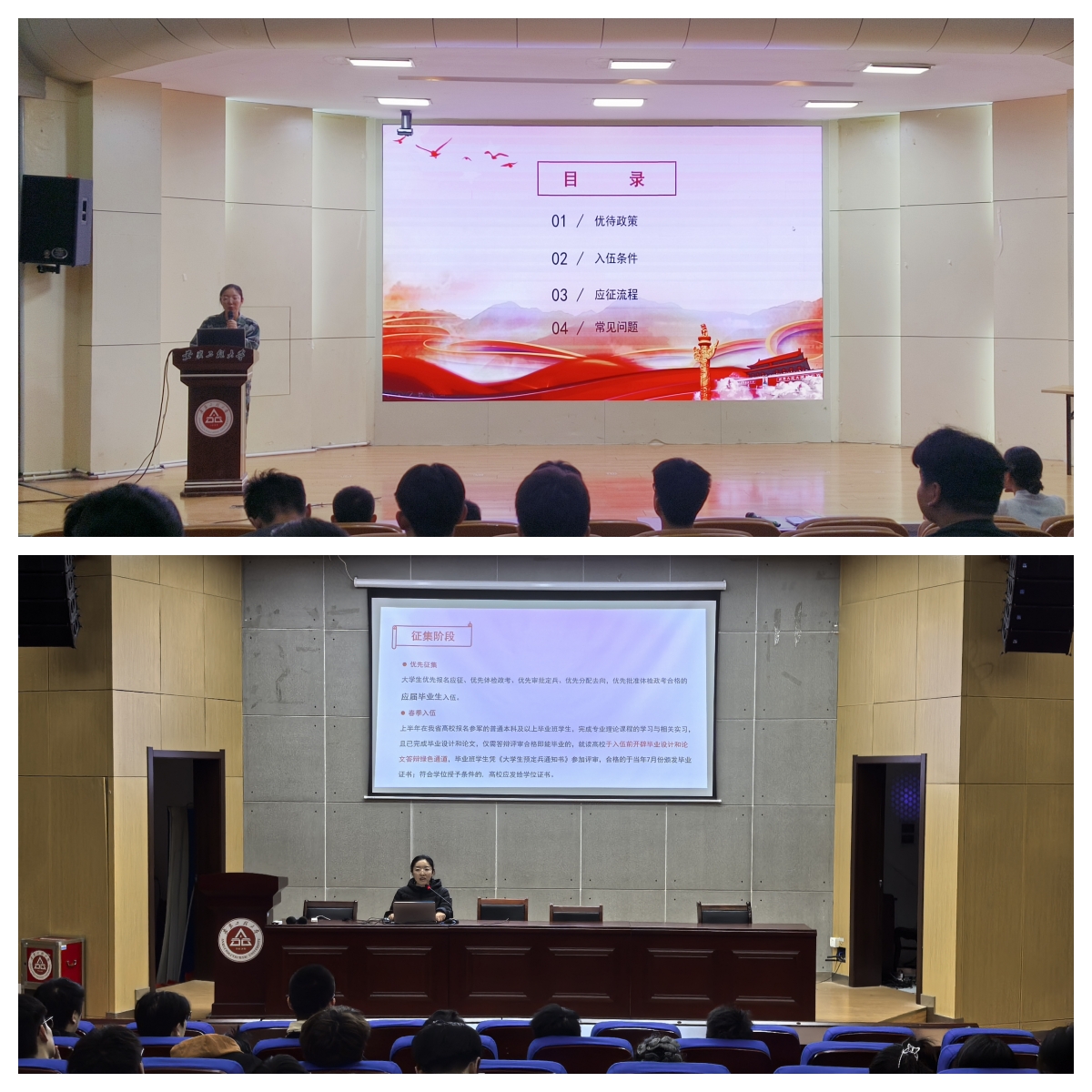结合学生就业,精准开展征兵宣讲。结合学院2025届毕业生考研就业动员会,学院邀请校学生处赵成婧结合学生就业及未来发展等开展精准宣传动员和宣讲。赵成婧向同学们详细介绍了大学生征兵优待政策、应征入伍条件以及大学生应征入伍流程。为了巩固征兵宣讲效果,各专业辅导员邀请赵成婧深入班级,以主题班会为载体作进一步的征兵动员,针对同学们比较关注的入伍体检、考研专项计划、政治考核等问题作了更为细致的讲解,现场为同学们答疑解惑,使同学们对于大学生应征入伍的相关政策有了更为全面和深刻的认识。赵成婧鼓励同学们积极响应国家号召,投身国防事业,将个人理想融入祖国发展,用青春书写绚丽无悔的人生篇章。