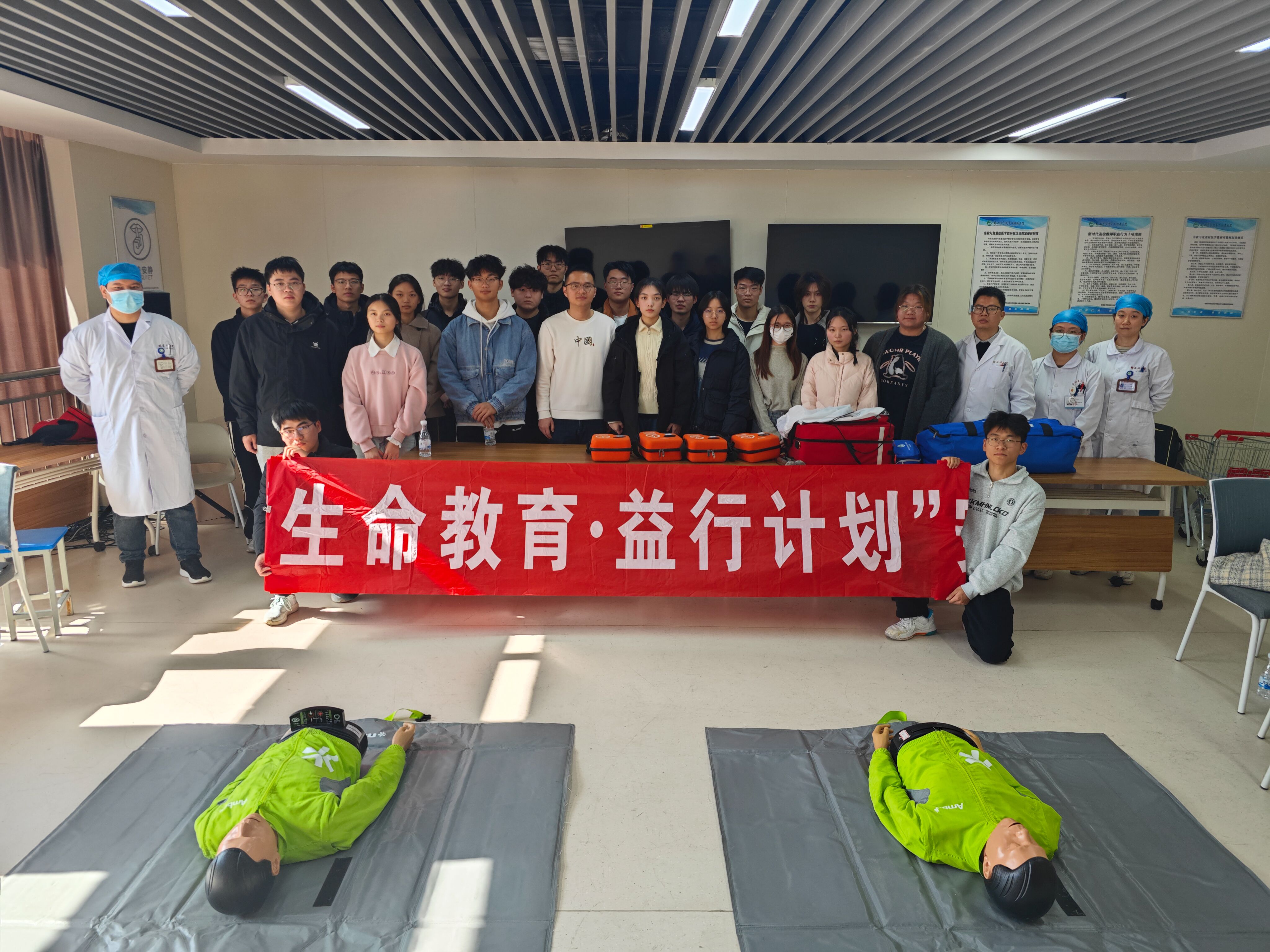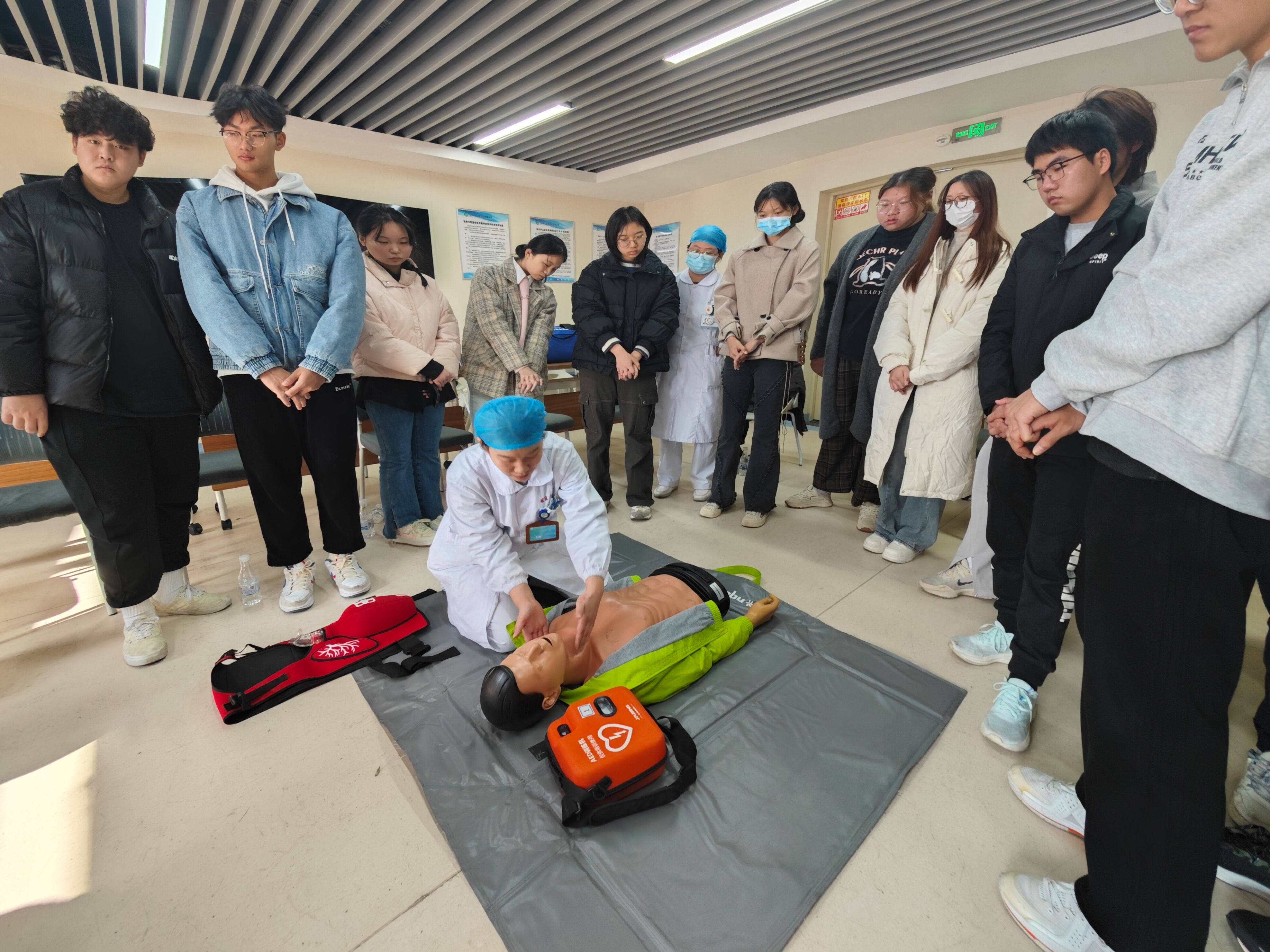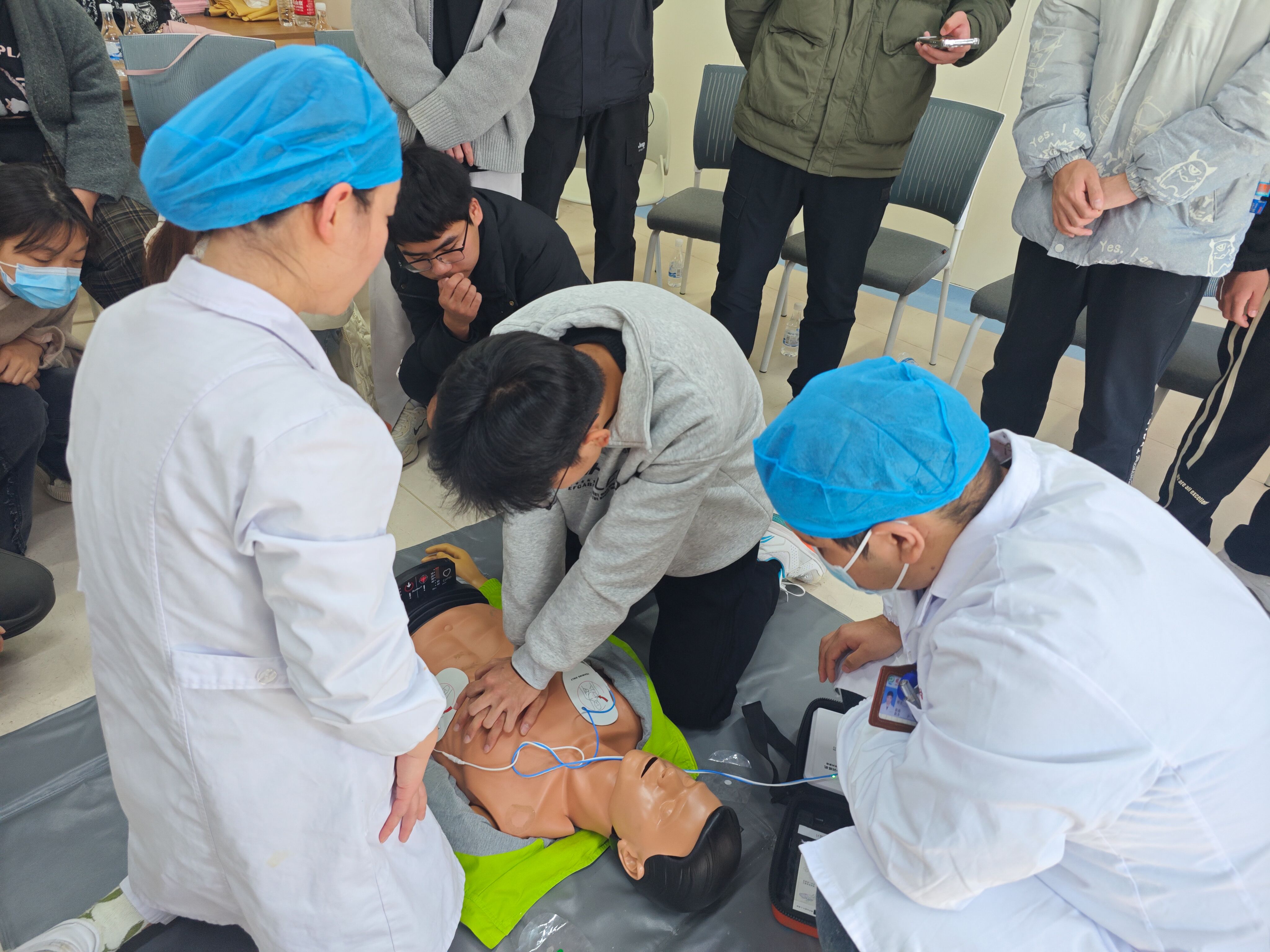 同学们在人体模型上进行心肺复苏术与“AED”使用练习,模拟现场急救演练。针对动作不规范问题,培训医生进行了纠正,并对同学们提出的问题进行了耐心讲解。