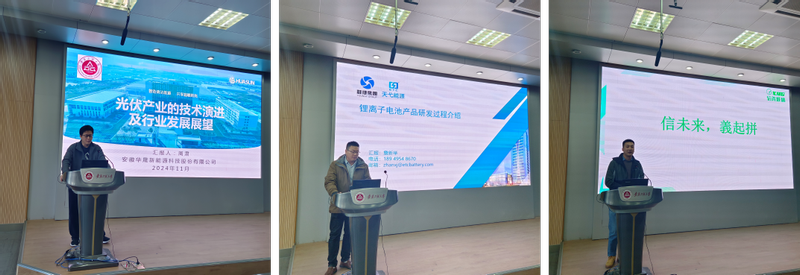 安徽华晟新能源科技股份有限公司技术总监周肃、芜湖天弋能源科技有限公司研发经理詹新举、信义玻璃科技(芜湖)有限公司人事经理柴永琪分别作精彩的主题报告,详细介绍了企业在新能源材料领域的研发成果、市场应用情况,以及前沿学术信息、行业动态、人才需求等。