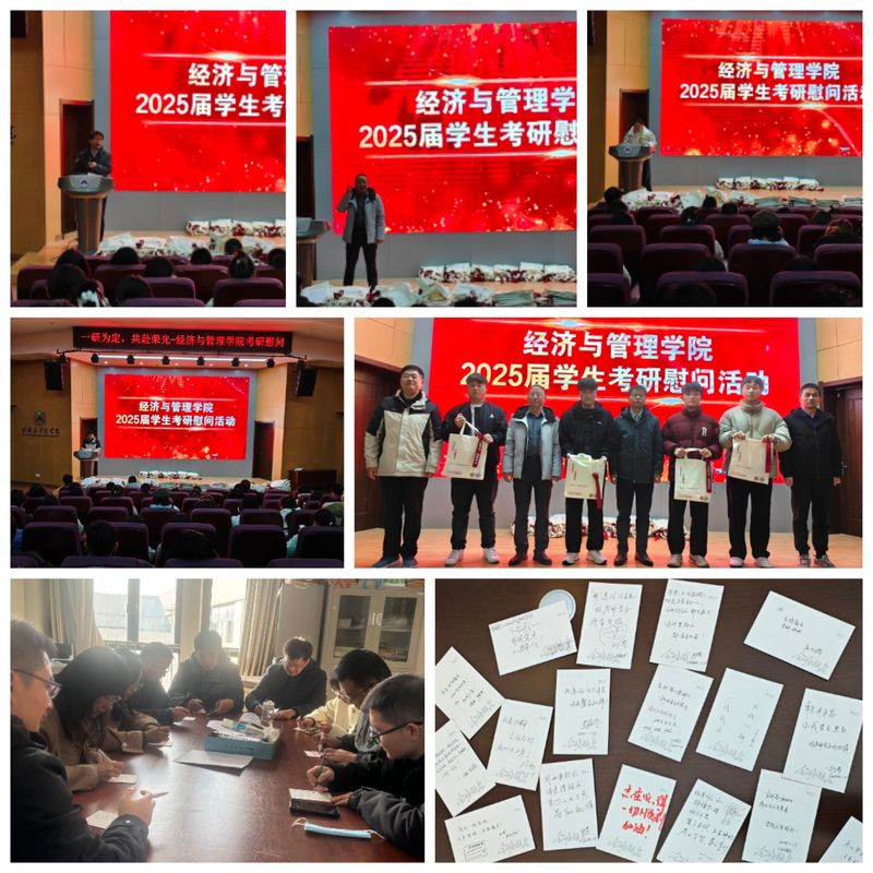 本网讯 为帮助考研学子缓解备考压力,坚定考研信心,助力学生在最后的冲刺阶段保持最佳状态,12月5日,经济与管理学院在C座七楼报告厅举办了以“研途相伴 温暖助力”为主题的考研慰问会。经济与管理学院党委书记水心宝、院长龚本刚、副院长桂云苗、团委书记赵恒梅、毕业班辅导员徐博与2025届全体考研学生参与,本次慰问会由经济与管理学院党委副书记刘海涛主持。