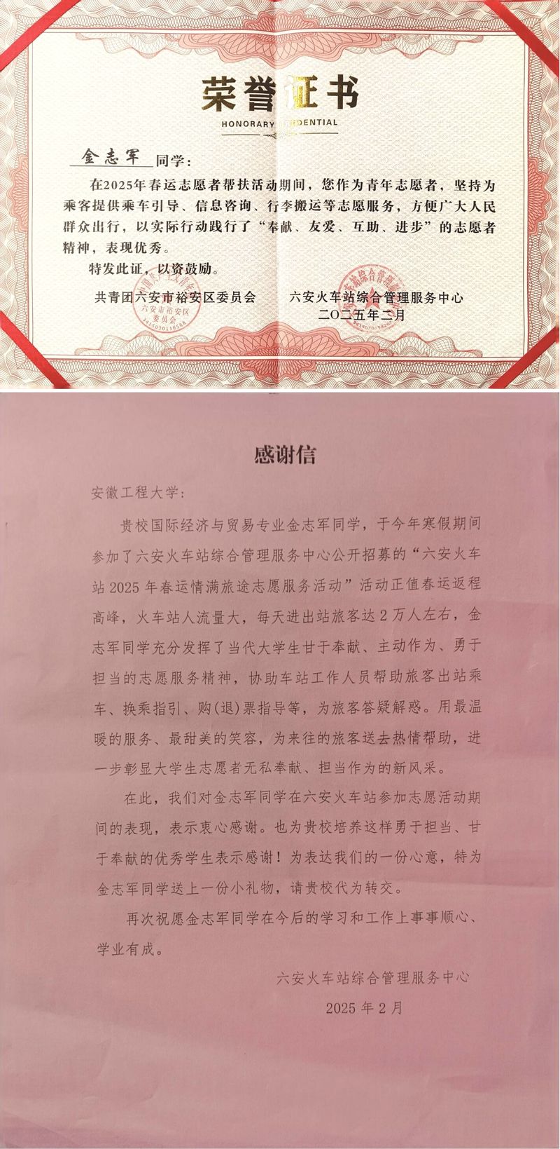 本网讯 3月10日,一封充满感谢之情的感谢信悄然送达学校。我校经济与管理学院国贸231班金志军同学在寒假期间参加六安市共青团组织的火车站春运帮扶志愿活动,过程中表现优异,获得共青团六安市裕安区委员会、六安火车站综合管理服务中心的表彰和感谢,得到了相关单位的高度认可,并收到了荣誉证书和表扬信。