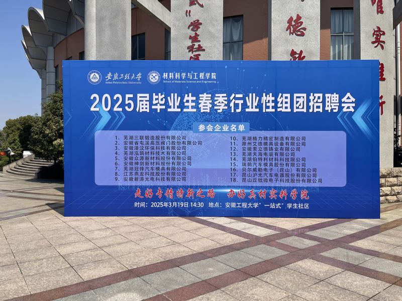 本次招聘会共吸引江苏燕龙科技股份有限公司、安徽省屯溪高压阀门股份有限公司、安徽泽汶环保科技有限公司、安徽众源新材料股份有限公司、贝尔威勒电子(昆山)有限公司等来自全国新材料、高端制造等领域的18家优质企业参会,为毕业生提供就业岗位300余个,覆盖材料成型及控制工程、材料科学与工程、机械设备制造、自动化等多个专业方向。