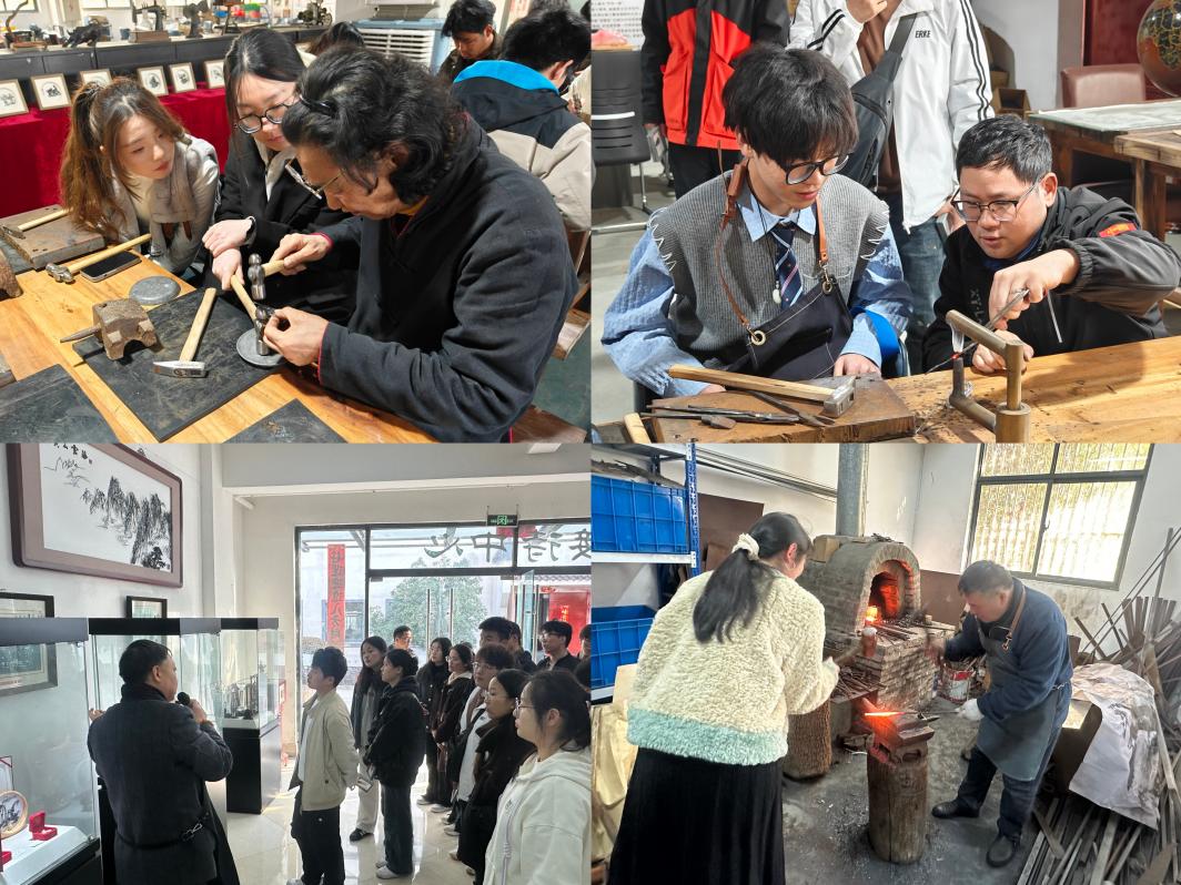 实践环节,学员们走进铁画锻造工坊、艺术展厅及红色主题创作区,近距离观摩铁画“以铁为墨、以锤为笔”的独特技艺流程。安徽省工艺美术大师、“安徽省著名商标”飞龙铁画创始人高文清结合《长征》《红旗颂》等经典铁画作品,讲述铁画技艺中蕴含的坚韧品格与家国情怀。学员们分组体验铁画制作,通过动手锤制铁片“葫芦”亲身体验芜湖铁画这一传统技艺。生工231吴悦表示:“在锤炼敲打中,我不仅学习到了铁画制作的基础技法,更深刻感受到非遗技艺背后精益求精的匠心精神。传统不是凝固的历史,而是握在我们手中的文化接力棒。”