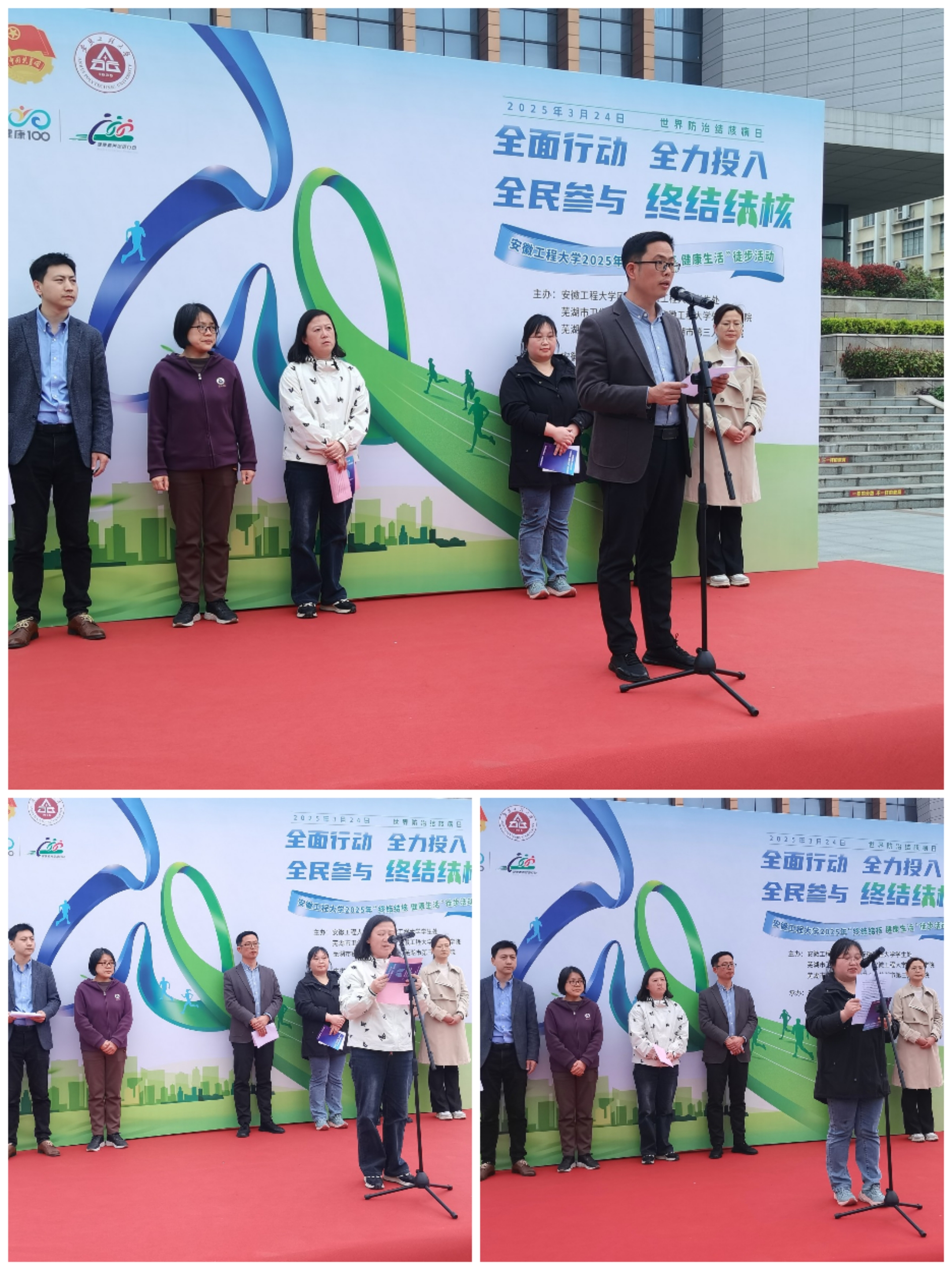 启动仪式上,校团委书记李恒奎在致辞中强调:“高校是健康教育的前沿阵地,本次活动将体育精神与疾病防治宣传深度融合,是深化‘健康中国’行动的生动实践。”芜湖市疾控中心副主任王斐现场宣读了《结核病防治倡议书》,呼吁大学生关注结核病防治知识,养成良好卫生习惯。芜湖市卫健委疾控科科长杨帆对我校“龙骨花”志愿团队在结核病防治宣传方面作出的贡献给予高度肯定,她进一步指出:“全社会需凝聚合力,筑牢结核病防控网络,为健康芜湖、校园安全注入新动能。”