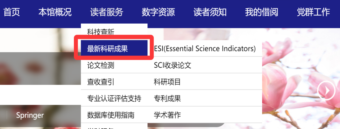 “最新科研成果”的访问途径为内网访问,数据来源为WebofScience、CNKI和泛研全球科研项目数据库。访问路径有三种方式,分别是网址访问、图书馆首页->读者服务菜单->最新科研成果和图书馆首页->读者服务模块->最新科研成果。