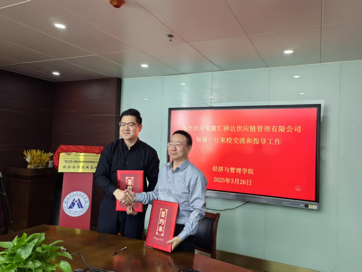 本网讯 3月26日,安徽汇驿达供应链管理有限公司(以下简称汇驿达)董事长秘书李本初和人力资源总监王涛一行四人来到经济与管理学院签订校企合作协议,并揭牌校企合作实践基地。本次签约和揭牌仪式在C座818会议室隆重举行,学院党委书记水心宝、院长龚本刚、副书记刘海涛、副院长桂云苗、物流科学系主任程永宏以及辅导员教师代表徐博参加了签约仪式。会议由桂云苗主持。