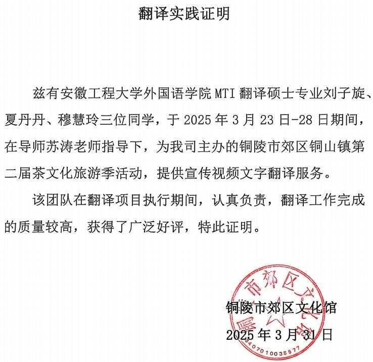 本网讯 4月1日,铜陵市铜山镇第二届茶文化旅游季活动盛大开幕,活动中的宣传视频以高质量的英文翻译,收获了国外游客的称赞。而这一成果,离不开外国语学院翻译团队的努力。翻译专业硕士24级学生刘子旋、夏丹丹、穆慧玲,在导师苏涛副教授的悉心指导下,承担并圆满完成了此次宣传视频的文本翻译项目。