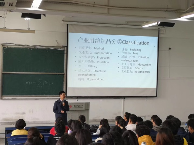 4月30日上午,邱夷平在5J217教室为纺织工程专业一、二、三年级学生做了题为《新型产业用纺织品》的精彩报告。报告围绕东华大学纺织学院在新型产业用纺织品领域的学术成果和产品开发展开,深入简出的阐述了小纺织大作为的行业发展前景,如天上飞的天宫二号飞船太阳能帆板是针织结构柔性可折叠高精尖纺织品,地上跑的地铁列车顶板、隔离板、车盖板系列纺织基复合材料,海里的核电站冷源综合防御系统工程用的智能纤网,民用中的PM2.5口罩等,正可谓纺织制造上可九天揽月、下可五洋捉鳖,邱教授生动风趣的演讲赢得了同学们的阵阵掌声,极大地增强了同学们的专业自信。