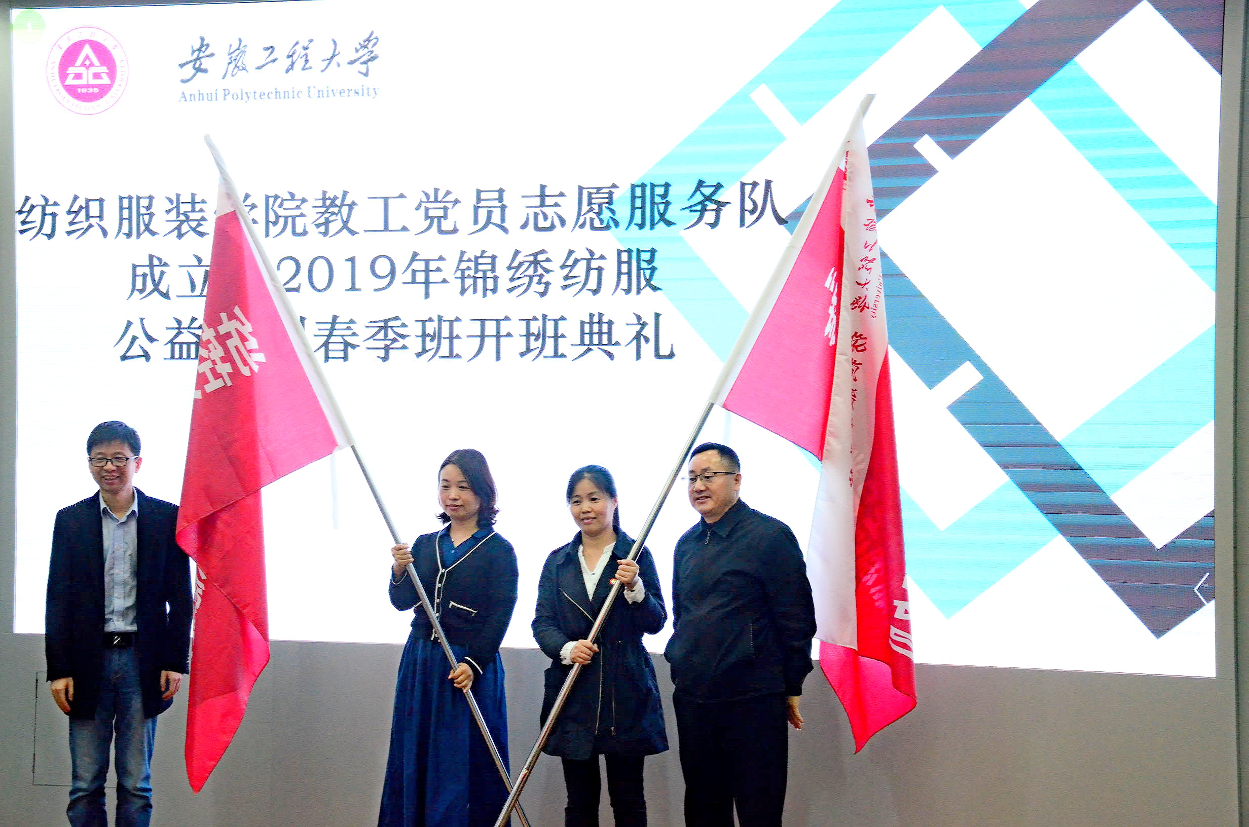会上发布了“锦绣纺服”公益计划,举行了教工党员志愿队授旗仪式。学生代表张金龙同学和教工党员代表邬红芳教授分别代表培训班学员和教工党员志愿者发言。